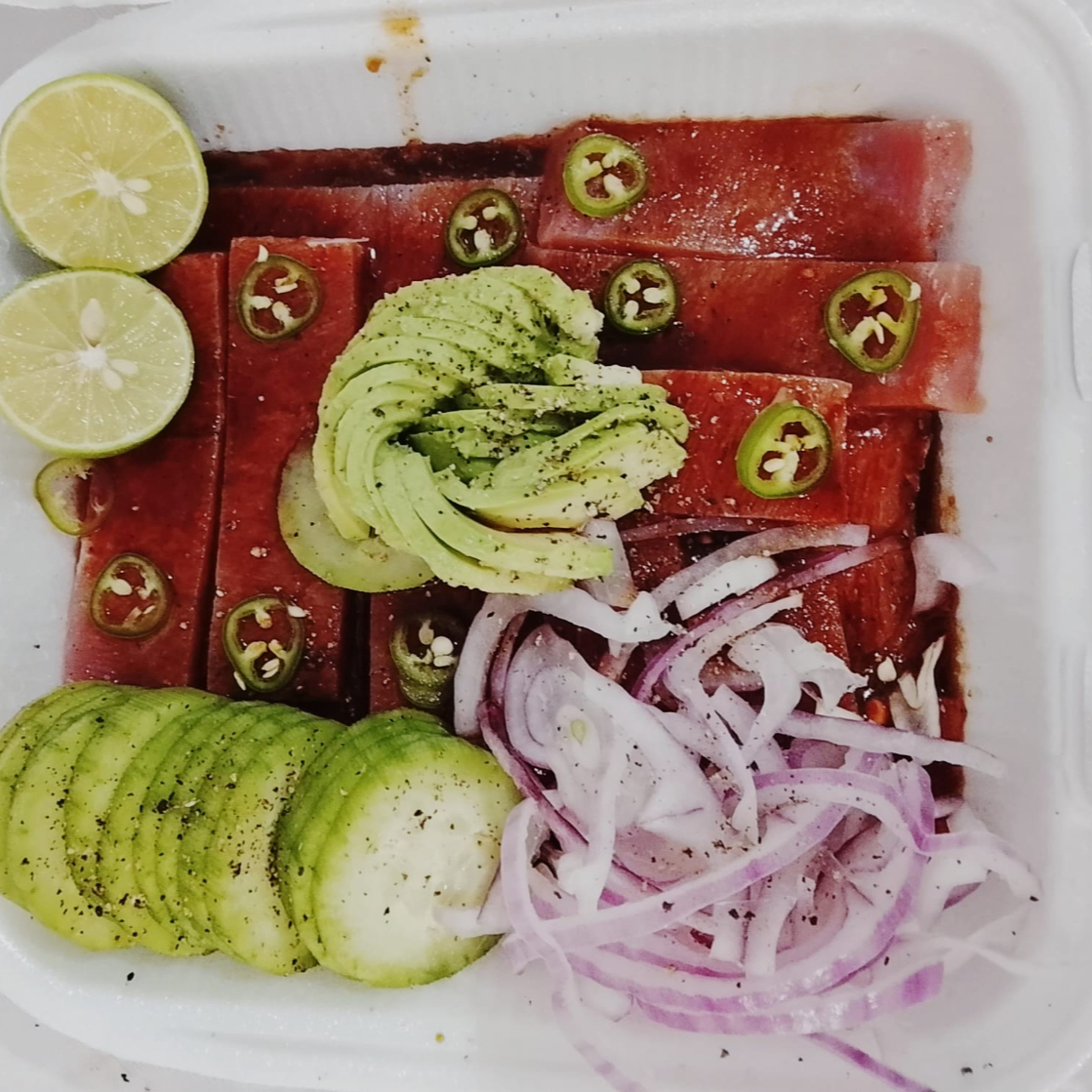 Láminas finas de atún fresco 120 g marinadas, acompañado de pimienta en rodajas, cebolla moren julianas, cilantro fresco picado y aguacate en cubos.