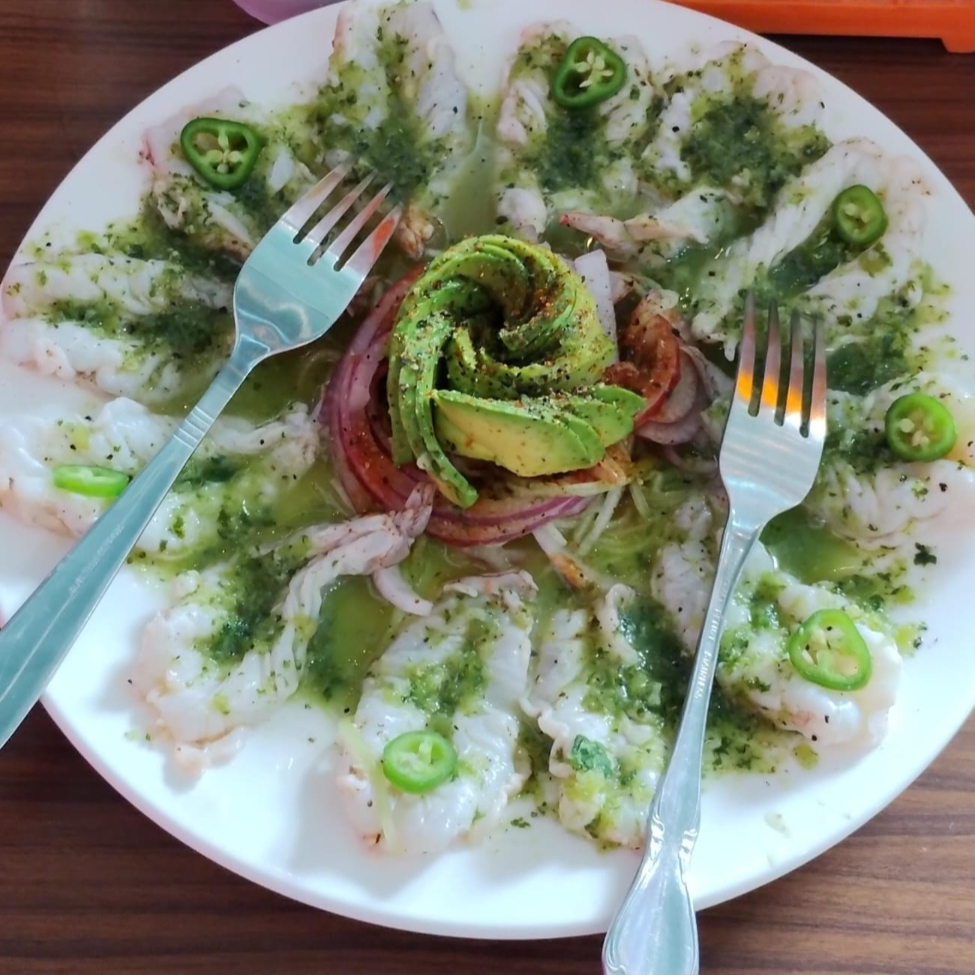 Camarón curtido en limón (150 g), bañado en salsa de chile serrano preparado con limón, ajo, sal y cilantro. Se acompaña con pepino, cebolla morada, cilantro fresco y aguacate. Se sirve frío y ligeramente picante.