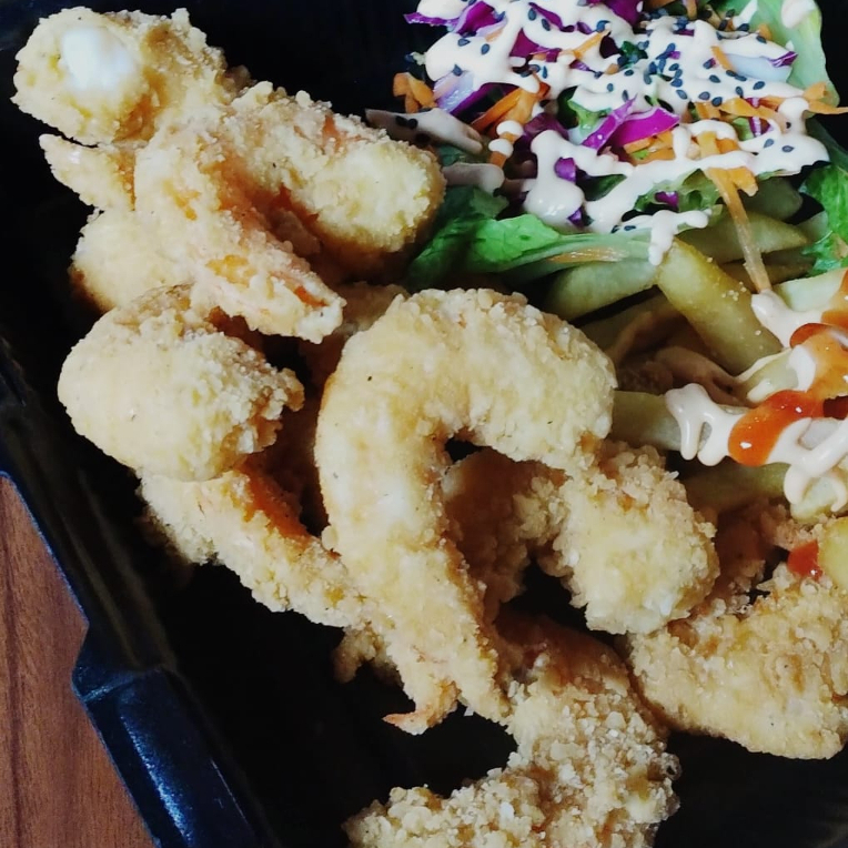 200 g de camarones empanizados con mezcla de harina, huevo, y coco rallado natural. Fritos y acompañados de ensalada (repollo morado, zanahoria, pepino), arroz blanco y aderezos dulces.