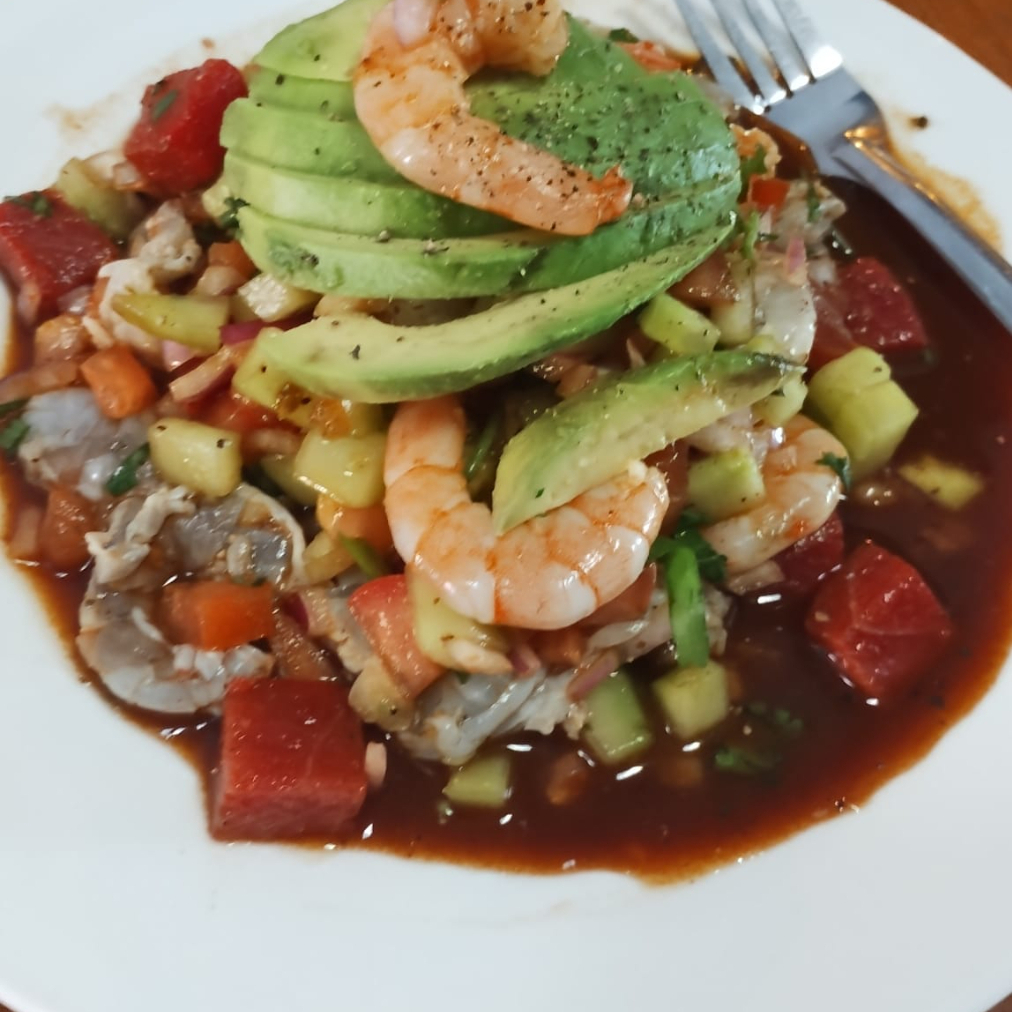 Ceviche mixto con 100 g de pescado blanco, 50 g de camarón cocido, 50 g de camarón curtido, 80 g de atún fresco en cubos, acompañado de cebolla morada, tomate, cilantro, aguacate y pepino. Marinado en limón sal, pimienta, y un toque de salsa negra tipo soya (10 ml).