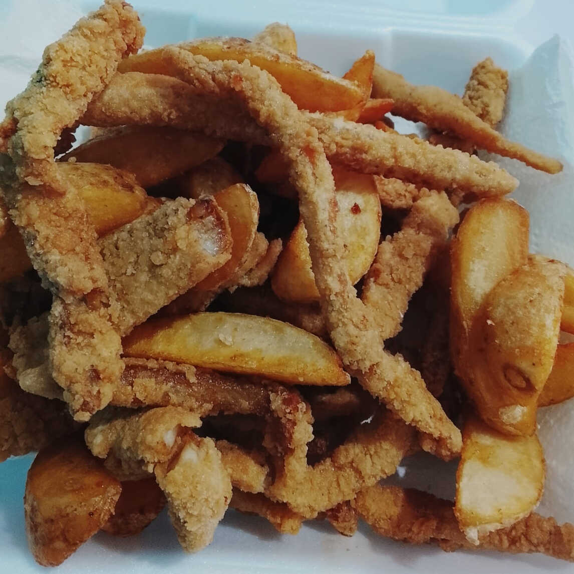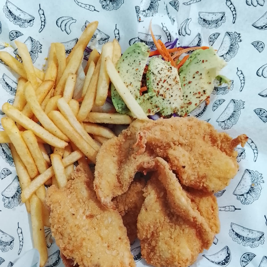 180 g de tiras de pescado blanco empanizadas y fritas, acompañadas de papas fritas (100 g), tortillas de maíz (3 unidades), salsa picante y aderezos.