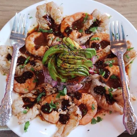Camarón curtido (150 g) en mezcla de salsas: mango habanero serrano , chiltepín y salsas negras. Se complementa con pepino, cebolla morada, cilantro fresco y aguacate. Toques de sal, jugo de limón y pimienta negra molida realzan el sabor.
