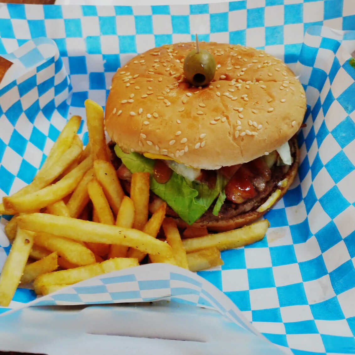 Una hamburguesa robusta con 150 g de carne de res tipo sirloin, acompañada de 2 tiras de tocino crujiente (30 g), 1 rebanada de queso amarillo y 1 rebanada de queso blanco. Se complementa con lechuga romana fresca, rodajas de tomate rojo, cebolla morada en julianas y aderezo estilo americano (mayonesa, mostaza, pepinillos y pimentón). Todo servido en pan brioche.