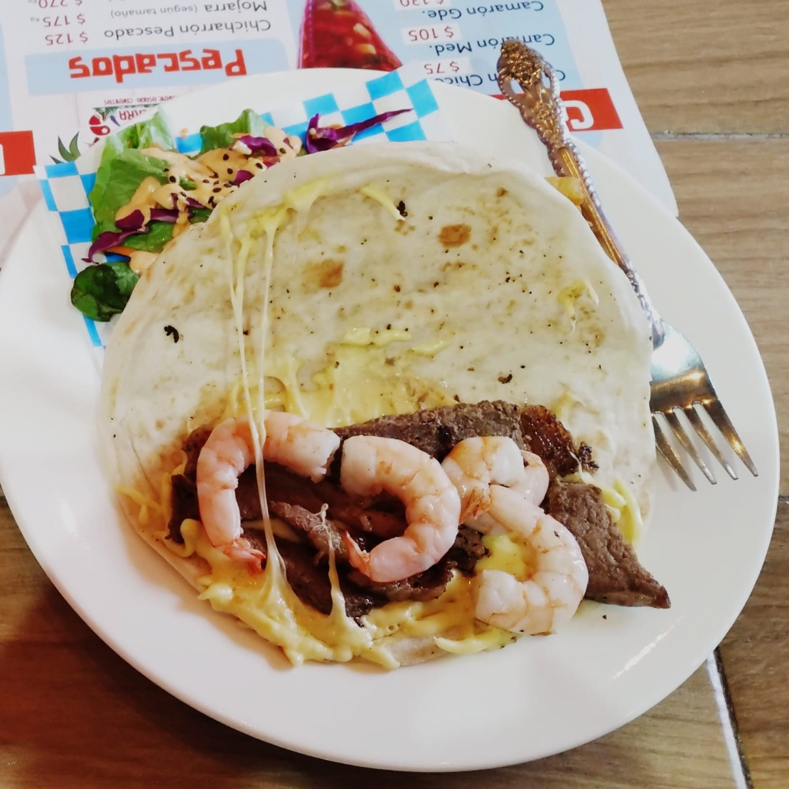 Tortilla de harina (60 g) con 60 g de carne asada y 40 g de camarón cocido, queso fundido, cebolla morada y salsa de mango habanero.