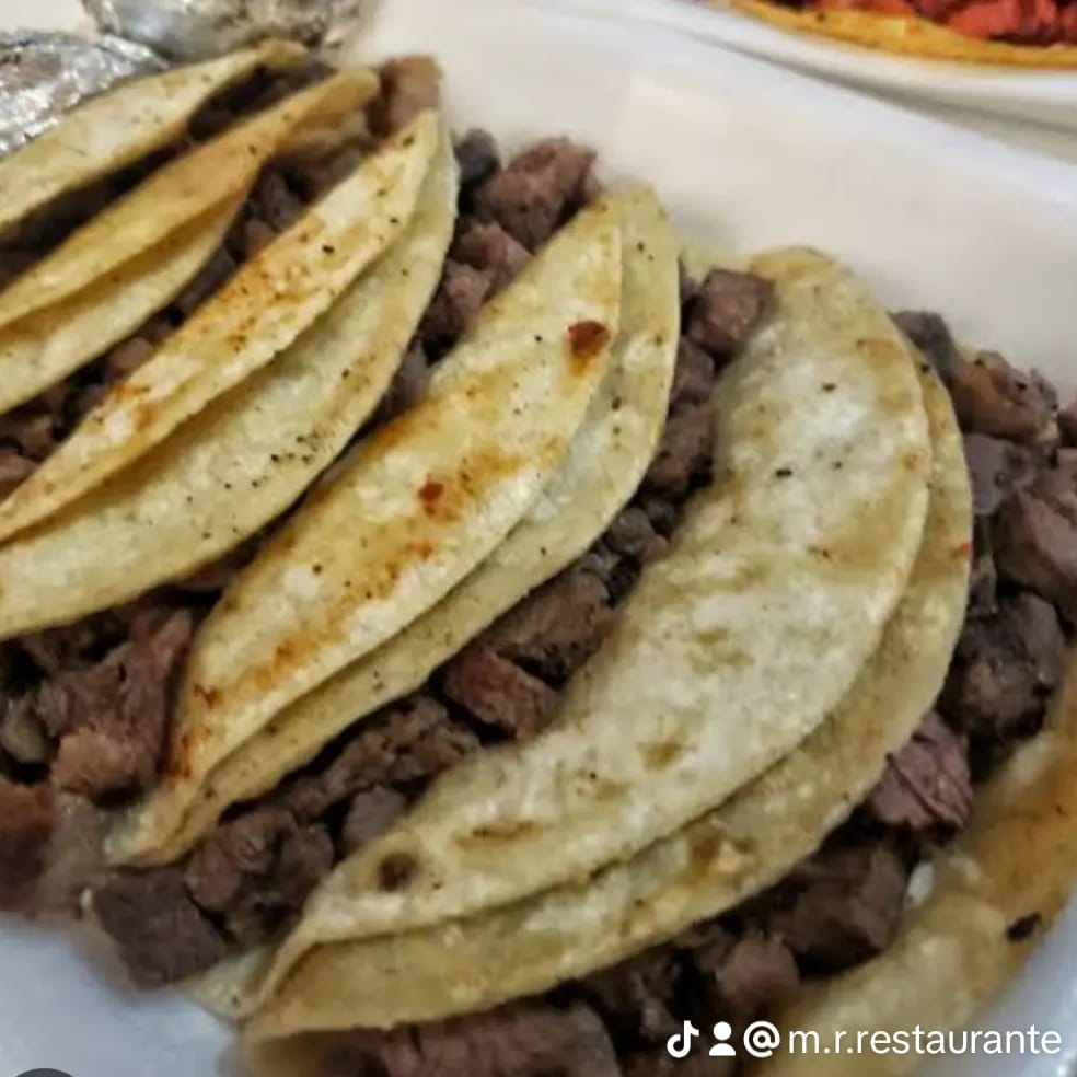 Tortilla de maíz (30 g) con 80 g de arrachera marinada en jugo de naranja, ajo, pimienta y comino. Se sirve con cebolla morada encurtida y cilantro.