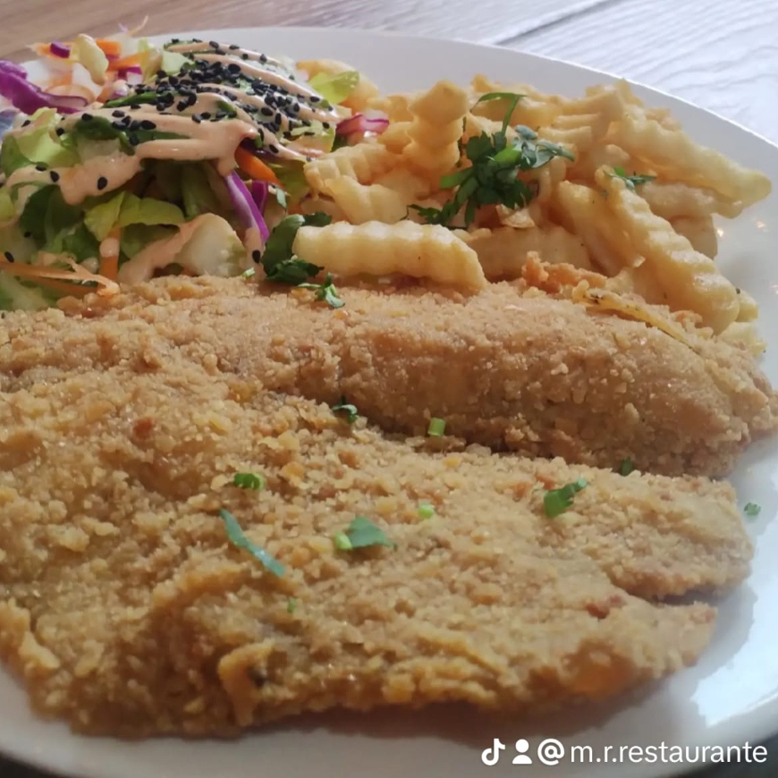 200 g de filete de pescado blanco, empanizado con pan molido, ajo en polvo, pimienta negra y sal, frito hasta dorar. Servido con ensalada (lechuga, tomate, zanahoria), arroz blanco, salsa tártara y aderezos.