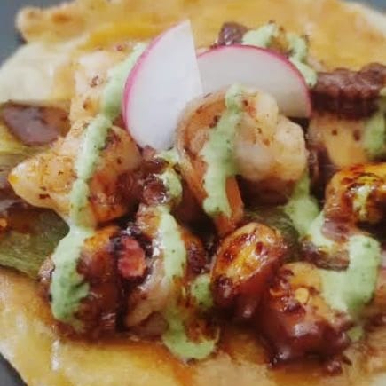 Tortilla de maíz (30 g) con 40 g de camarón y 40 g de pulpo a la plancha, bañados en salsa Zaranda (a base de chile guajillo, ajo y limón), con queso fundido y cebolla morada.