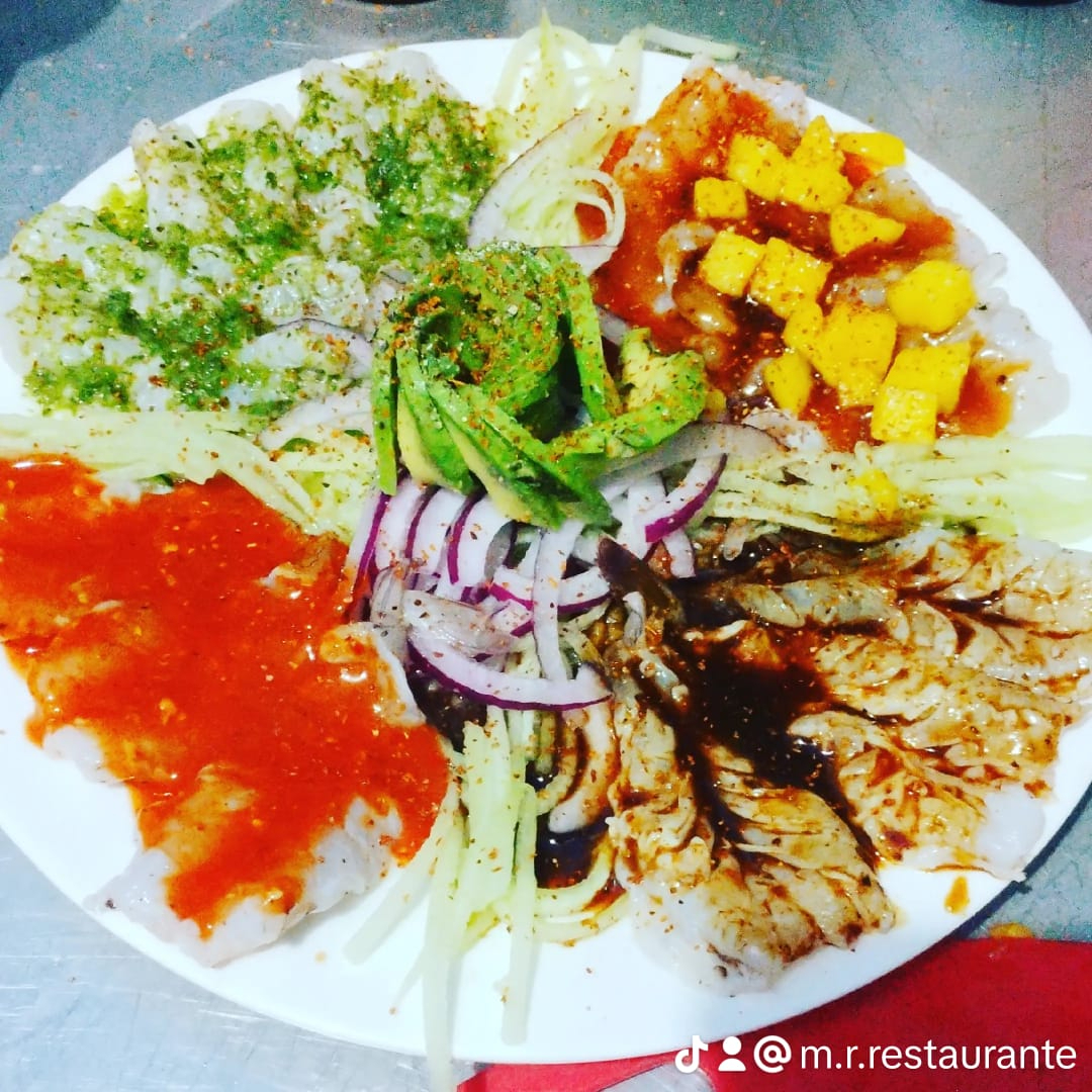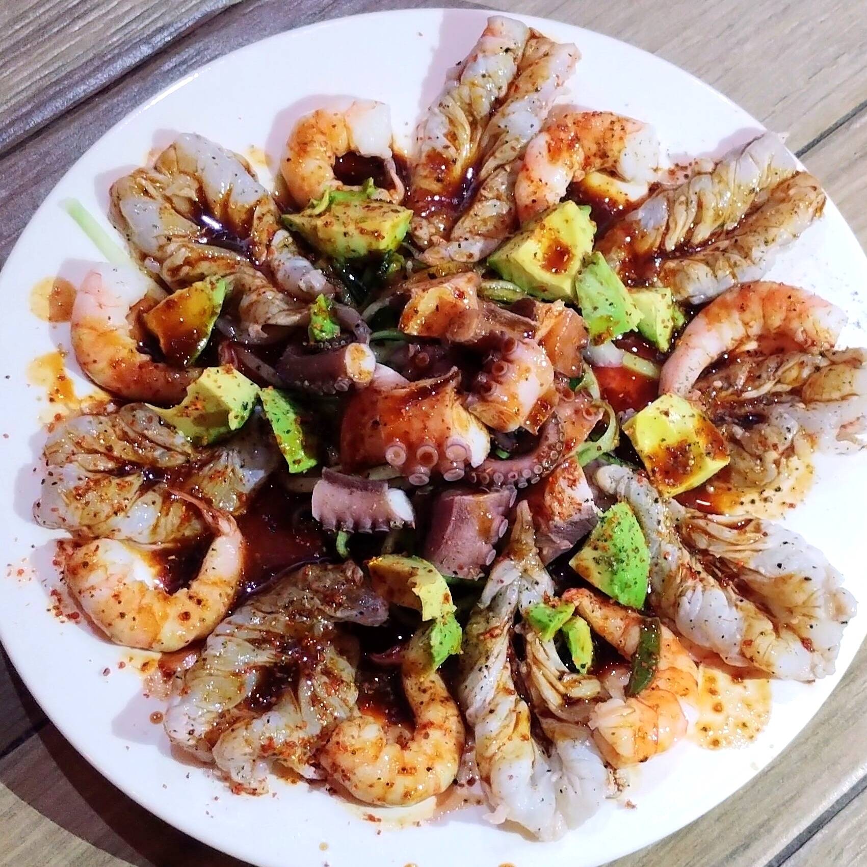 Mezcla de camarón cocido (80 g), camarón curtido (80 g), cubos de atún fresco (60 g) y pulpo a la plancha (60 g), bañados en salsas negras. Se acompaña con pepino, cebolla morada, cilantro fresco y aguacate. Se sazona con jugo de limón, sal y pimienta.