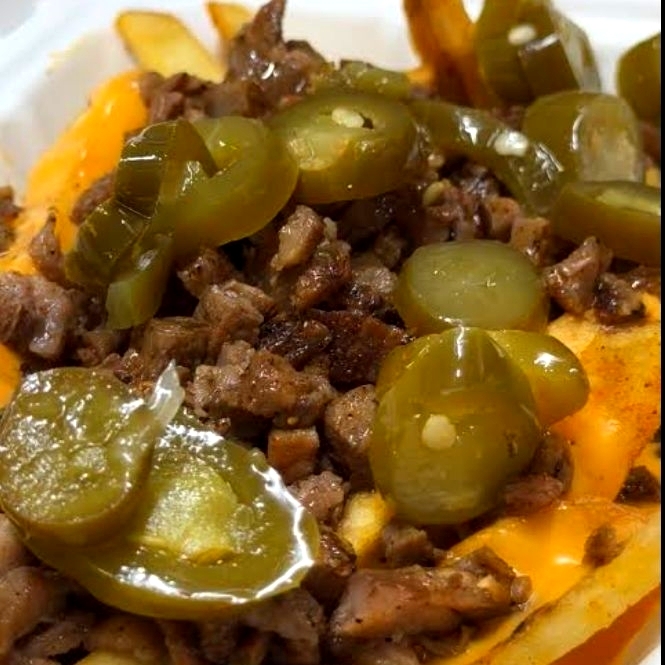 Papas fritas (180 g) cubiertas con 100 g de carne asada marinada con ajo, comino y orégano. Se acompañan con 30 g de cebolla caramelizada, queso rallado, jalapeños en rodajas y aderezos como crema agria y salsa chipotle.