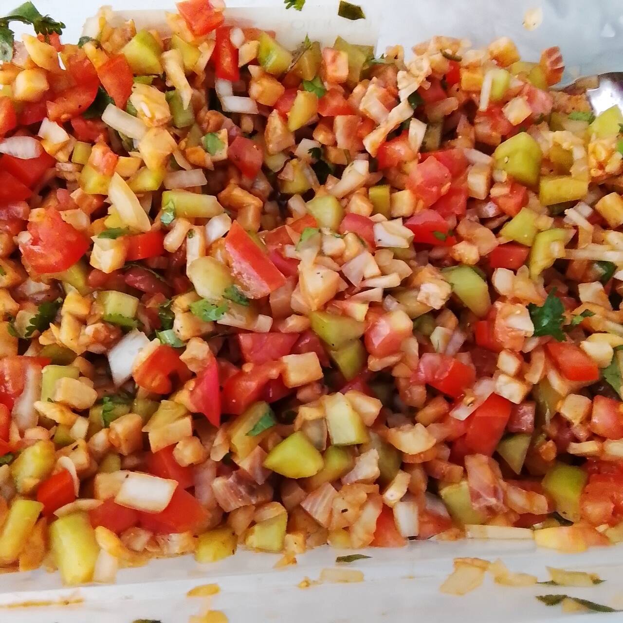 Combinación de 150 g de pescado blanco y 150 g de camarón limpio y cocido, marinados en jugo de limón (100 ml) con cebolla morada, tomate, cilantro, pepino y aguacate en cubos. Sazonado con sal, pimienta, y un toque de ají dulce. Porción para 2 personas.