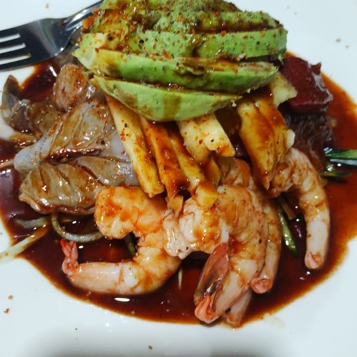 Tostada (25 g) con camarón curtido (60 g), camarón cocido (60 g), cubos de atún fresco (40 g) y pulpo a la plancha (40 g), bañados en salsa negra picosa. Se acompaña con pepino, cebolla morada, cilantro y aguacate.