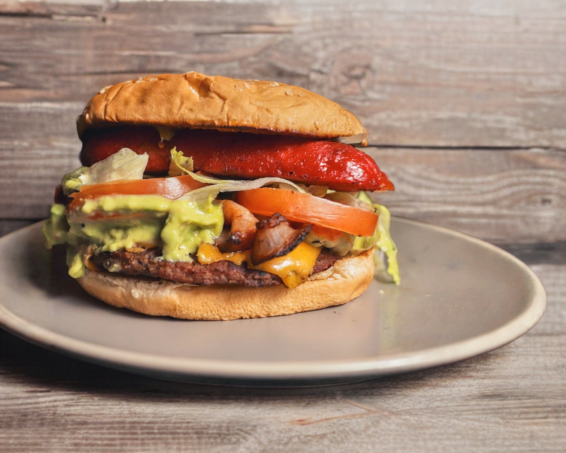 HAMBURGUESA CON QUESO AMARILLO, AGUACATE, TOCINO, PIÑA, VERDURA Y CHILE