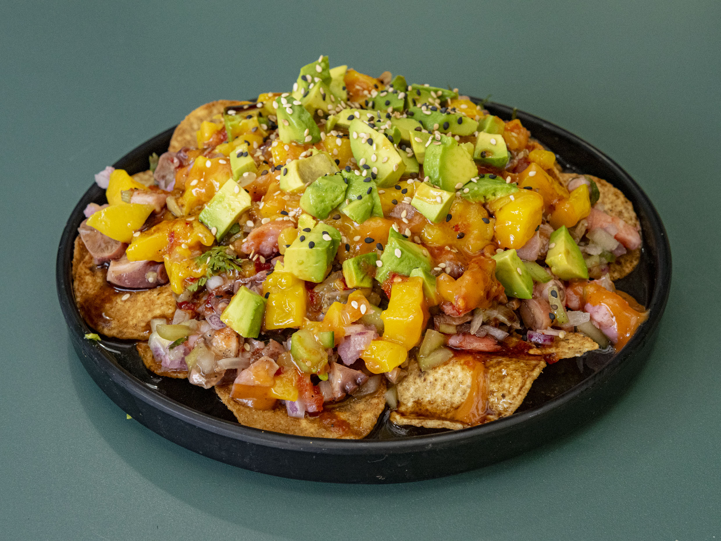 Ceviche de camarón, pulpo, surimi, camarón cocido, ceviche de pescado, mango, aguacate y salsa negra.