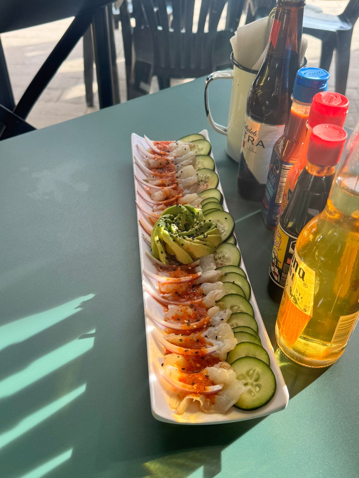 Camarón, pulpo, callo, pepino, cebolla, cilantro y salsa negra.