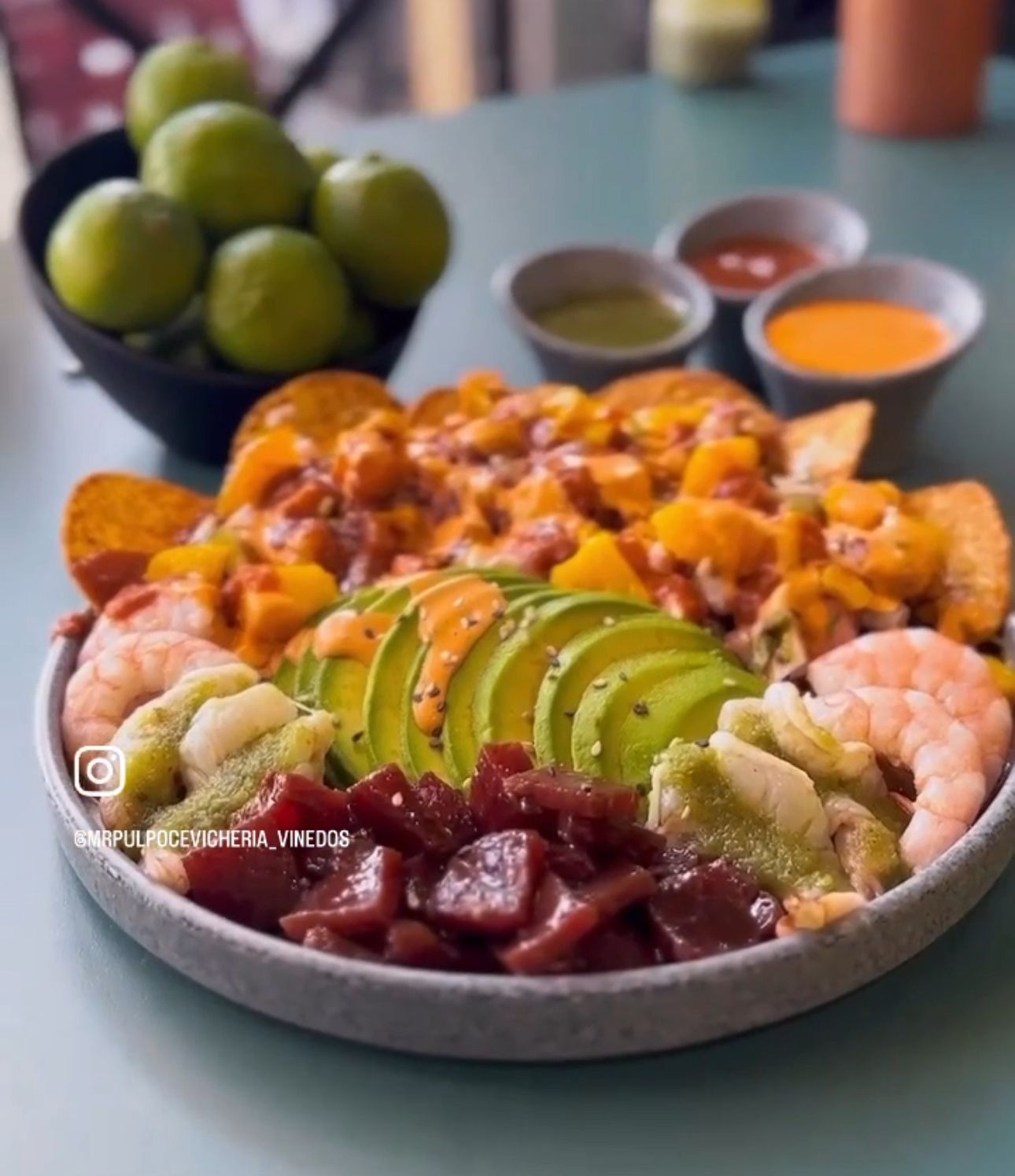 Aguacate, atún marinado, aguachile, camarón cocido, pulpo, salsa roja, salsa negra, aderezo chipotle, chile serrano y aceite de oliva.