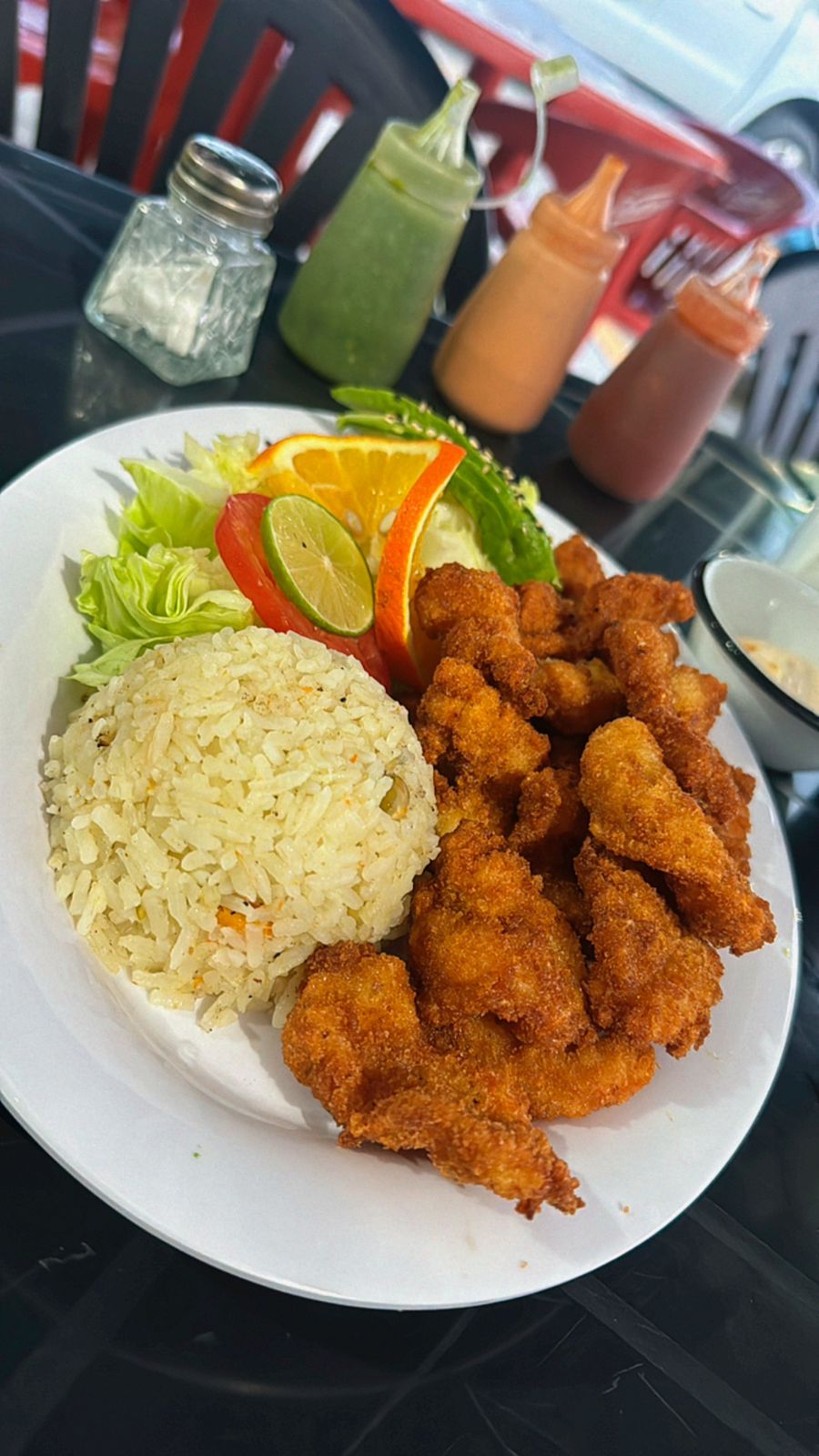 Camarón cocido, pulpo, camarones empanizados, pepino, cebolla, mango y salsas de la casa.