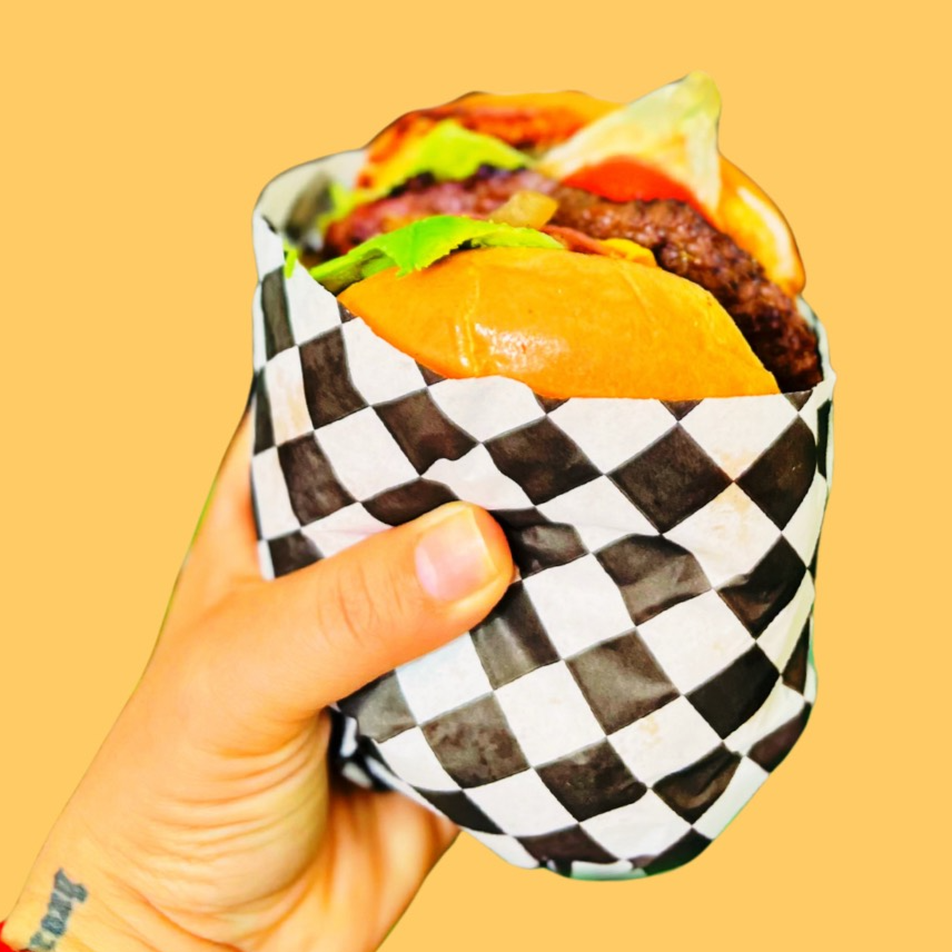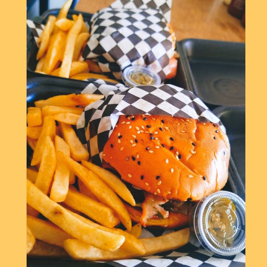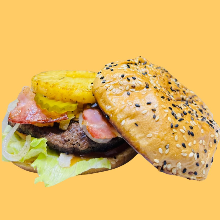Pan brioche con ajonjoli, carne, jamon, queso, piña, tocino, lechuga, tomate, cebolla asada, mostaza, mayonesa y catsup