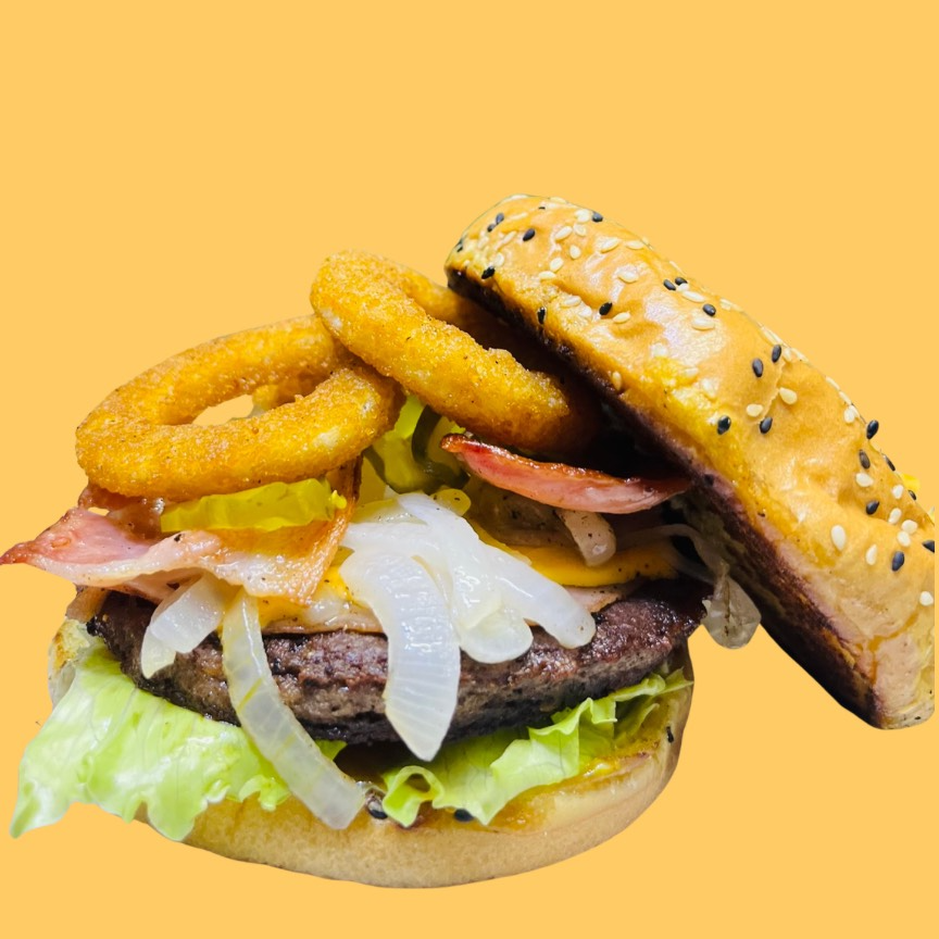 Pan brioche con ajonjoli, carne, jamon, queso, tocino, aros de cebolla, lechuga, tomate, mostaza, mayonesa y catsup