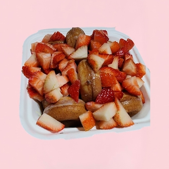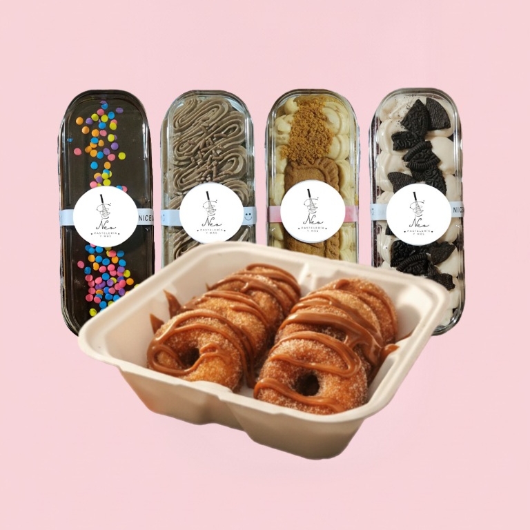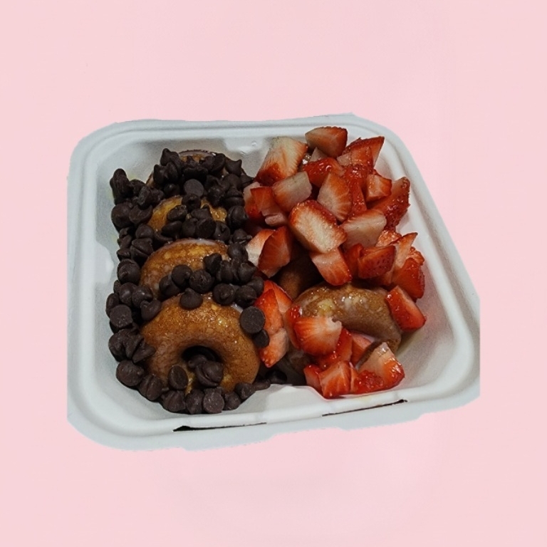 10 mini donitas con azucar y canela, cubiertas de dulce de leche.