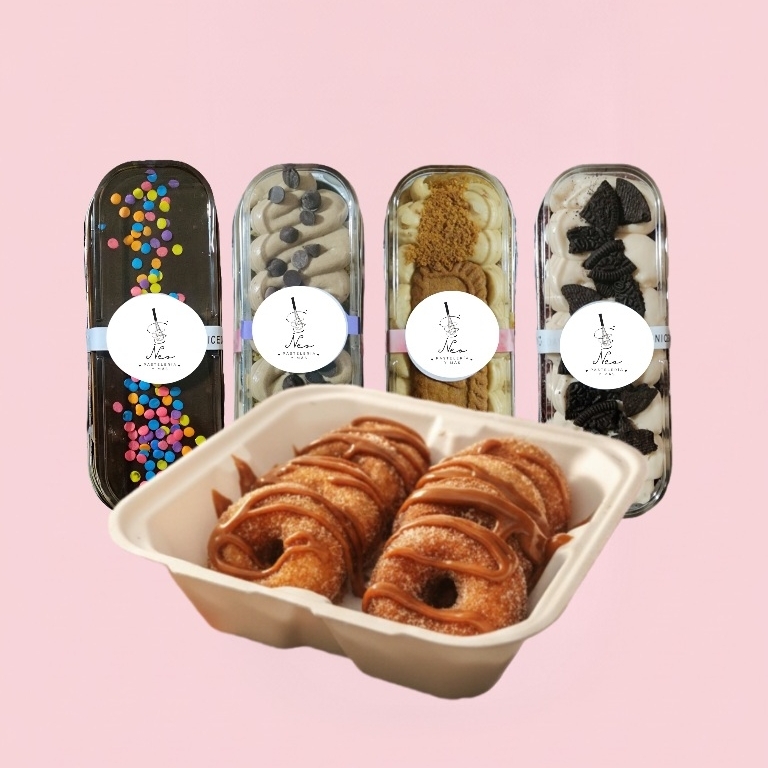 8 mini donas, con 1 cobertura y 2 toppings