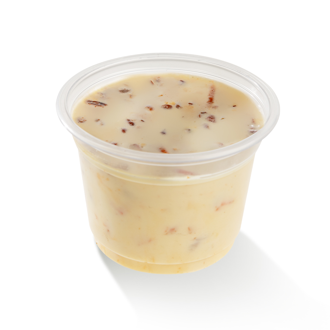 Postre fresco a base de yogurt con trozos de durazno y piña en almíbar, sobre base de galleta maría y cubierto de nuestra exclusiva granola gourmet.