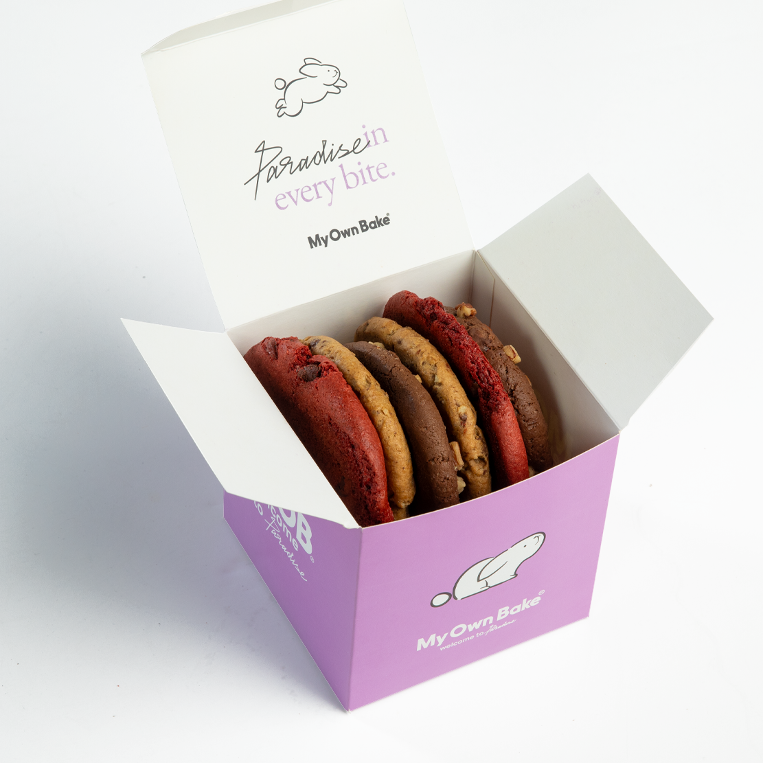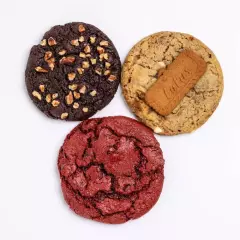 Caja con 6 galletas de sabor: red velvet, chocolate chip y tortuga.