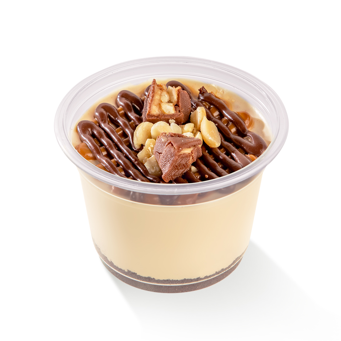 Cremoso cheesecake sabor snickers con base de galleta oreo y decorado con trocitos de chocolate snickers.