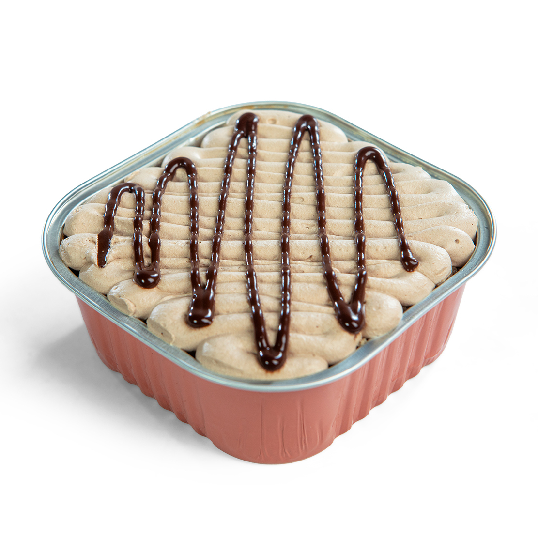 Pan de chocolate bañado en tres leches, cubierto con crema batida de chocolate decorado con lineas de chocolate semi amargo.