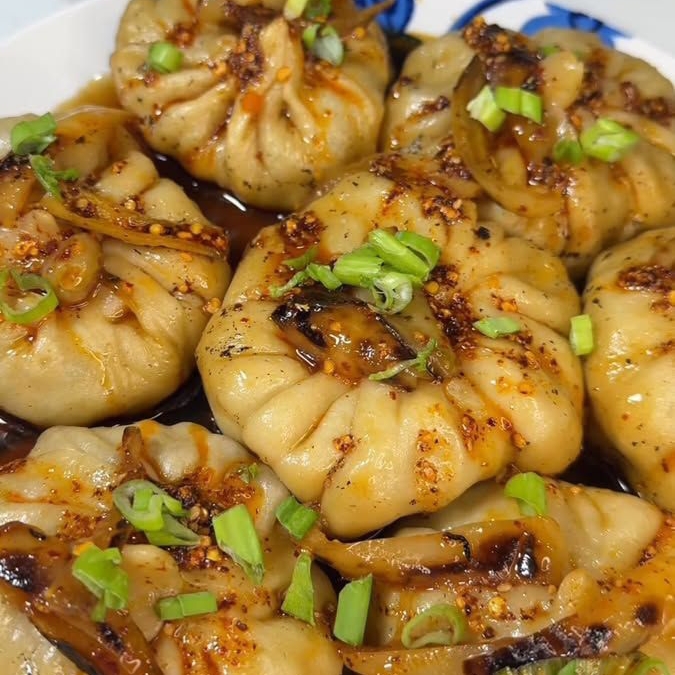 8 pzs de dumplings rellenos de carne molida con vegetales, acompañado de salsa de soya y salsa macha