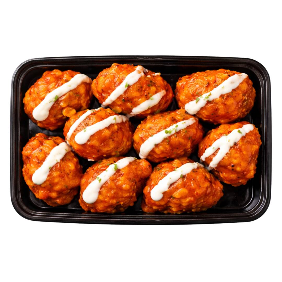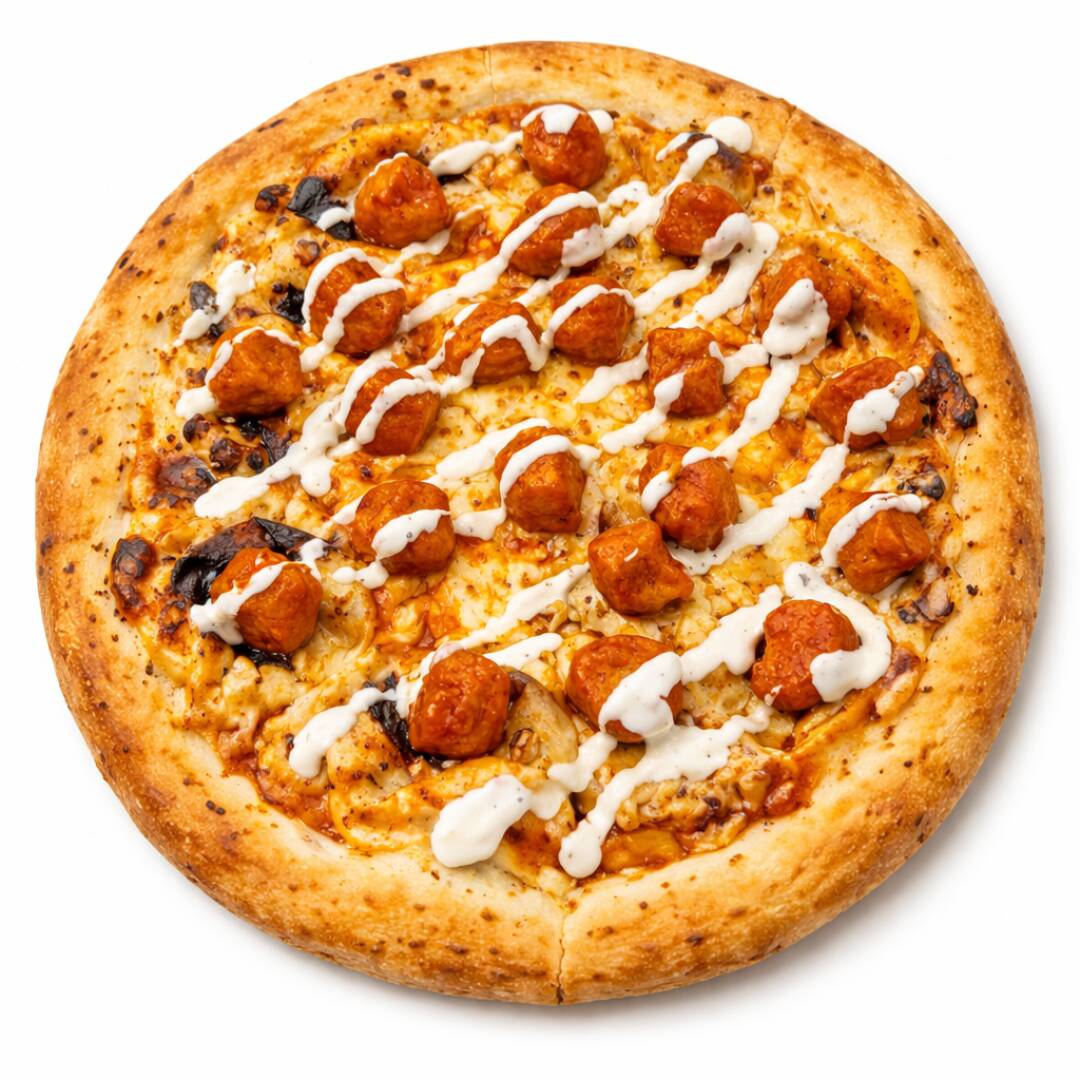 Pizza tamaño familiar salsa mango habanero, trozos de pechuga de pollo empanizada y aderezo a elegir