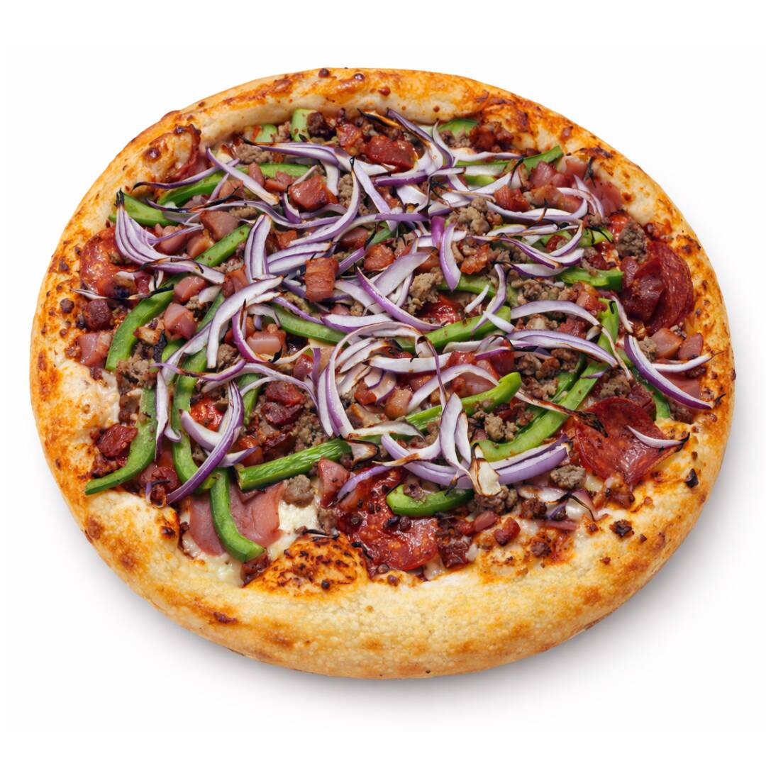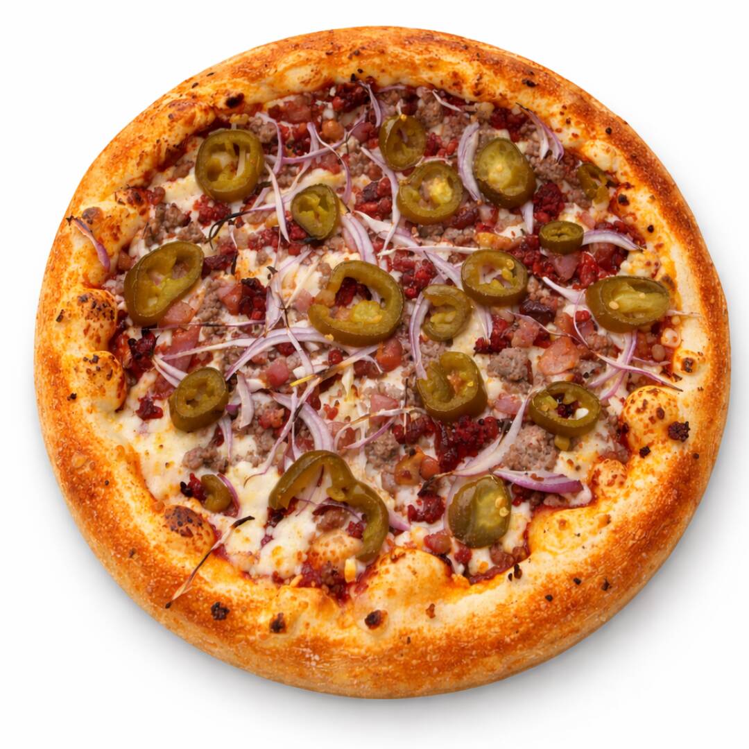 Pizza tamaño familiar salsa morita, queso, jamón, tocino, chorizo, carne molida, cebolla y jalapeños