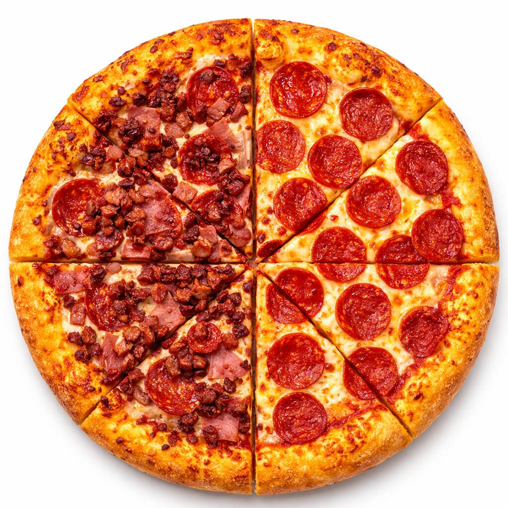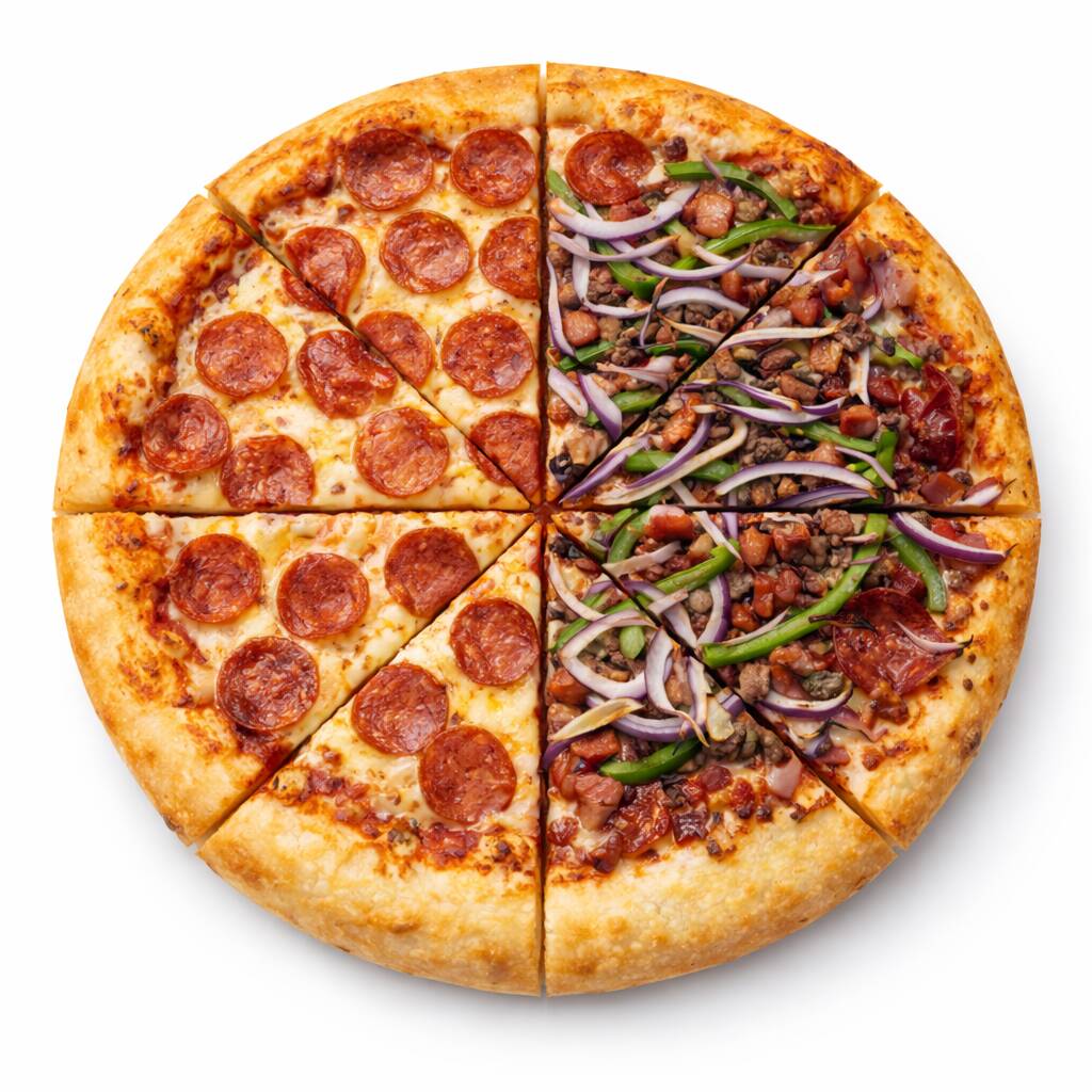Pizza con una deliciosa combinación de ingredientes: mitad suprema y mitad pepperoni, para satisfacer todos los gustos.