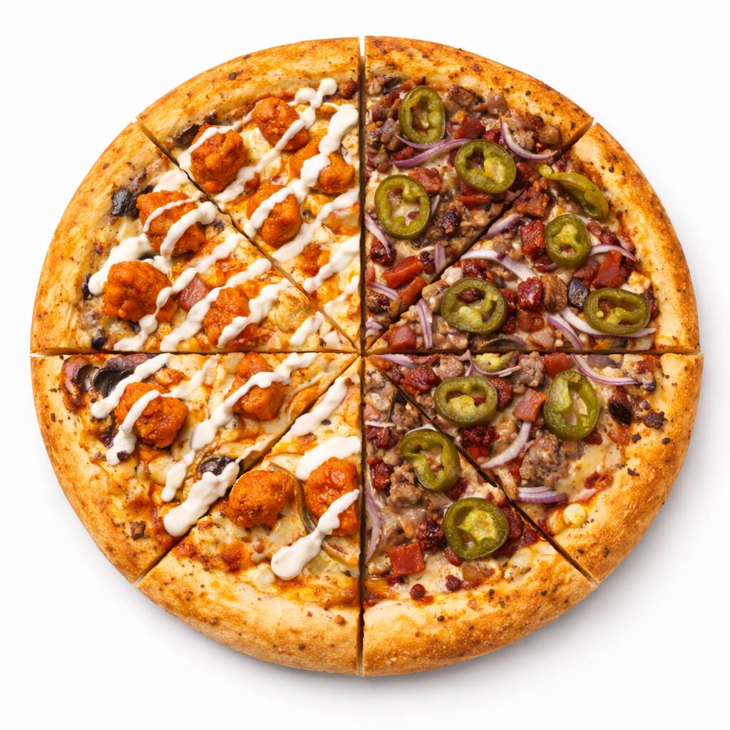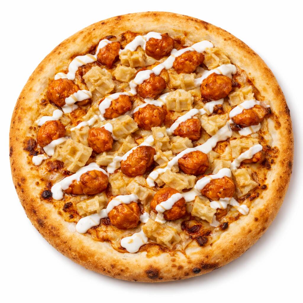 Pizza tamaño familiar salsa mango habanero, trozos de pechuga de pollo empanizada, waffles, miel de maple y aderezo a elegir