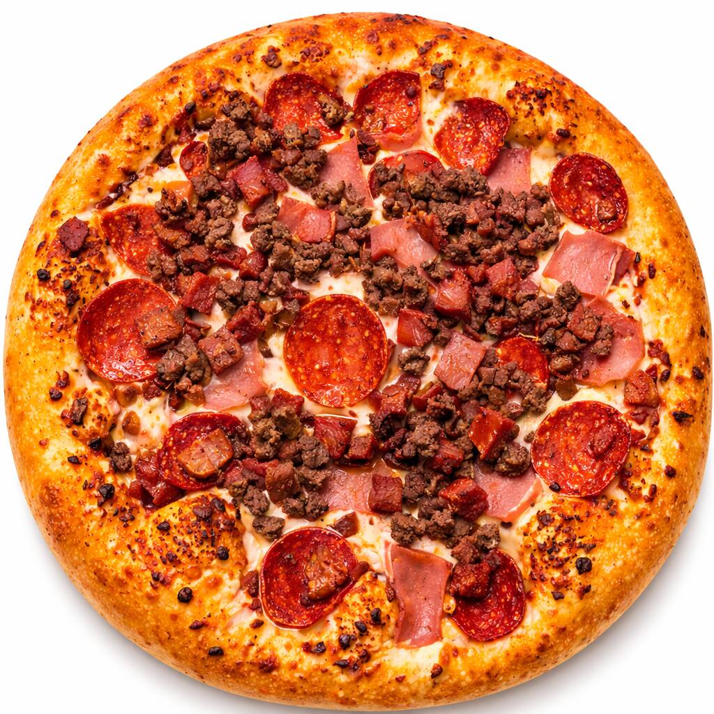 Pizza tamaño familiar salsa morita, queso, pepperoni, jamón, tocino y carne molida.