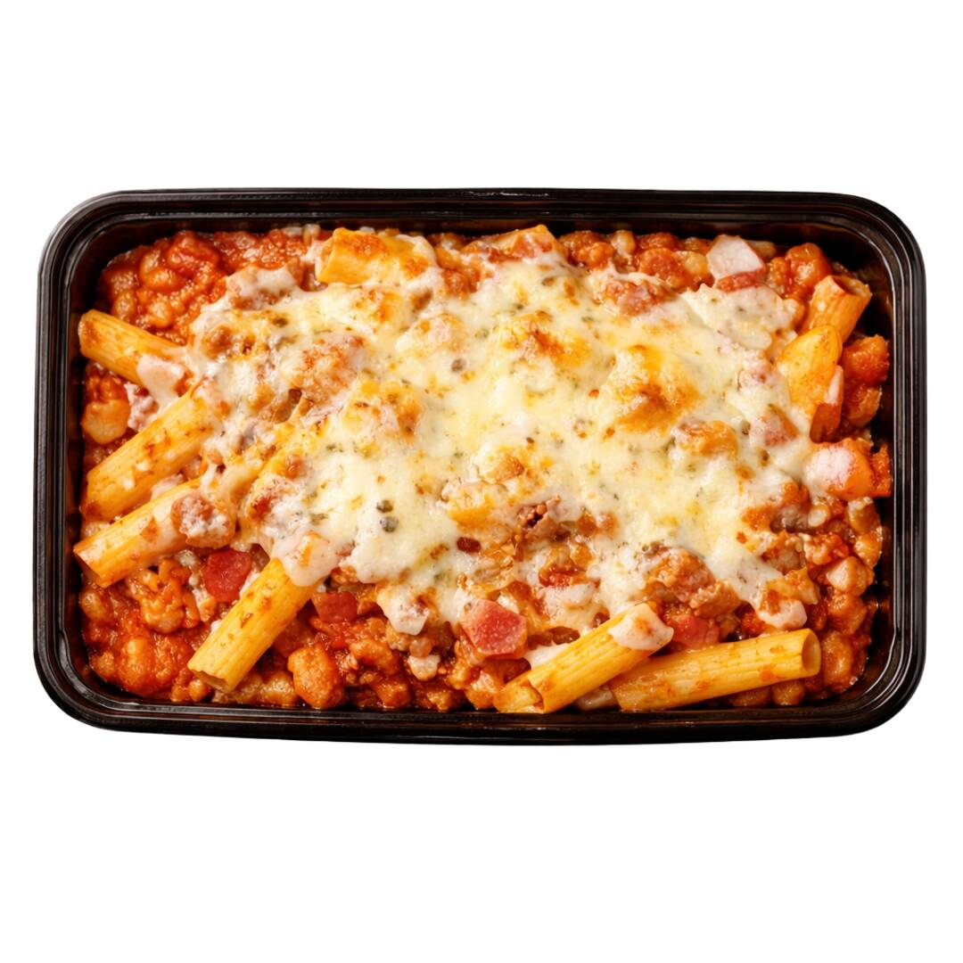 Pasta penne con carne molida, jamón, nuestra especial salsa marinara y queso gratinado.