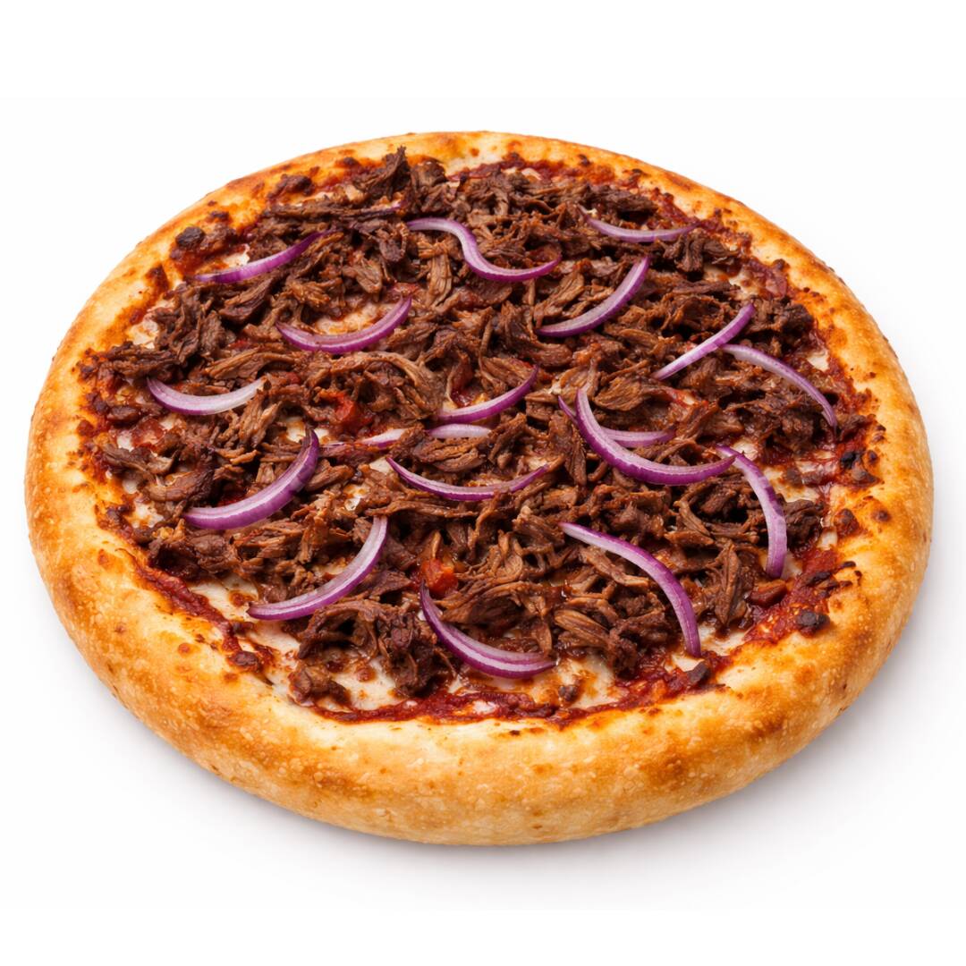 Pizza tamaño familiar salsa morita, birria y consomé De temporada