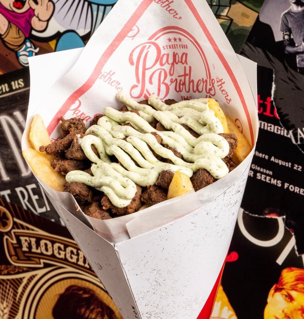 Cono con papas fritas 250 g, dos especialidades y aderezos a elegir, ya preparado.
