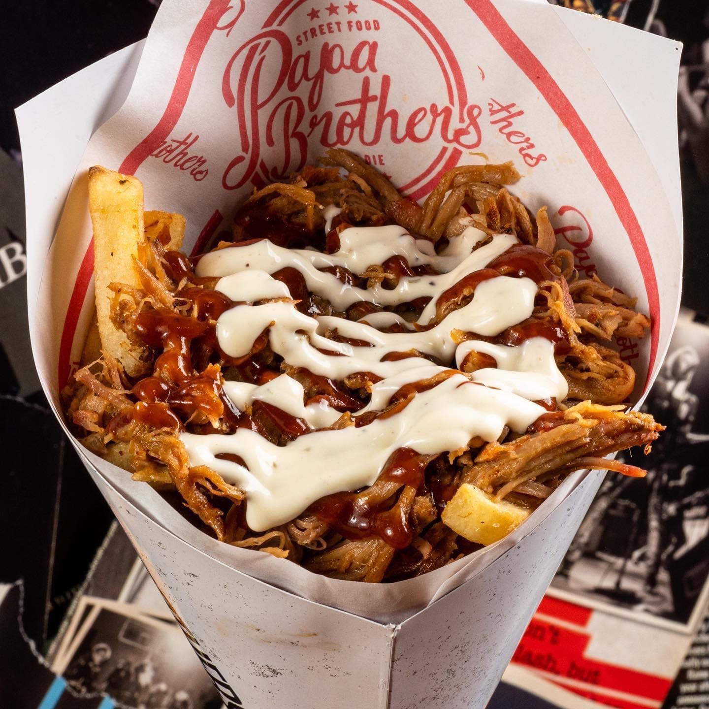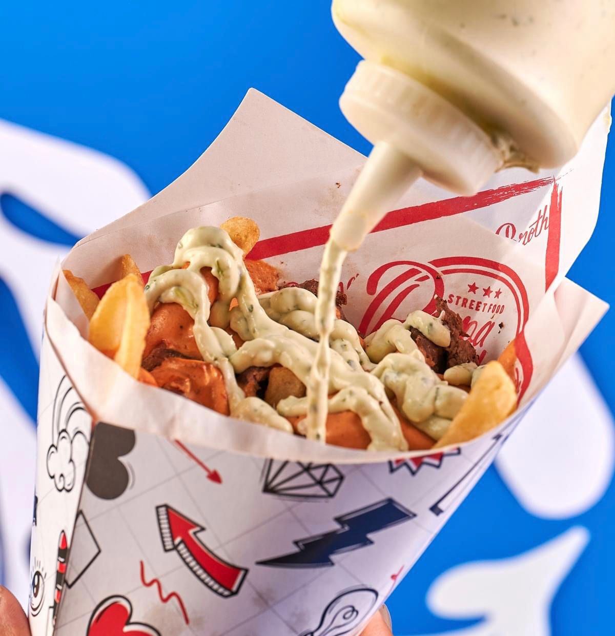 Cono con papas fritas 250 g, tres especialidades y aderezo.