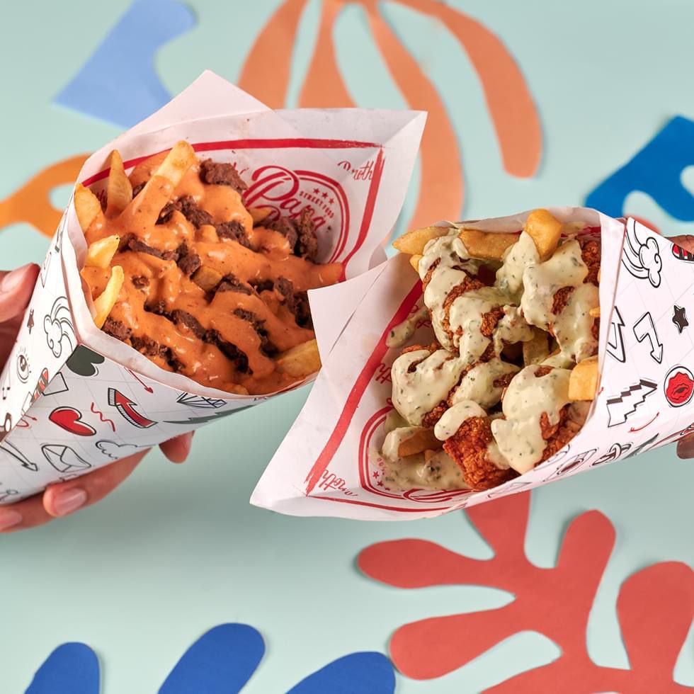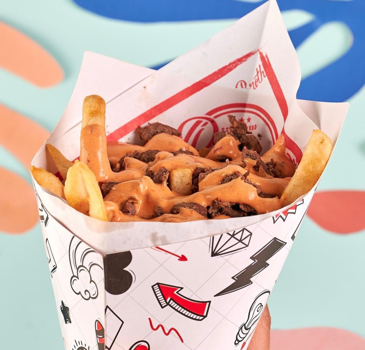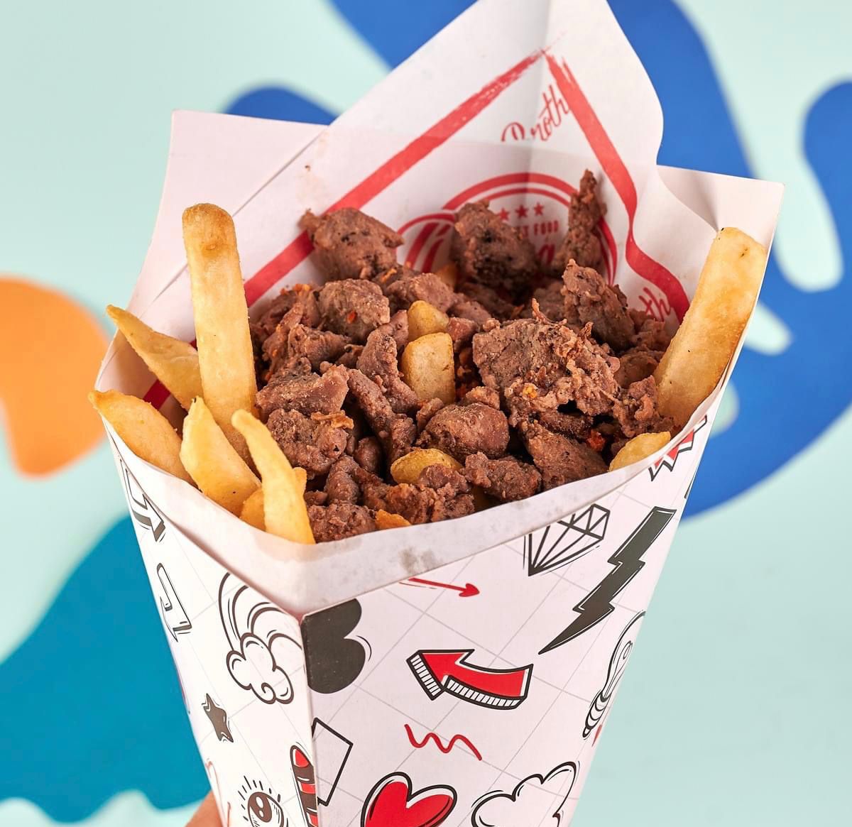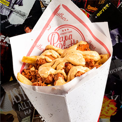 Cono con papas fritas 250 g, una especialidad y un aderezo a elección, ya preparado.