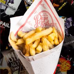 Cono con papas fritas 250 g y aderezo a elección, ya preparado.