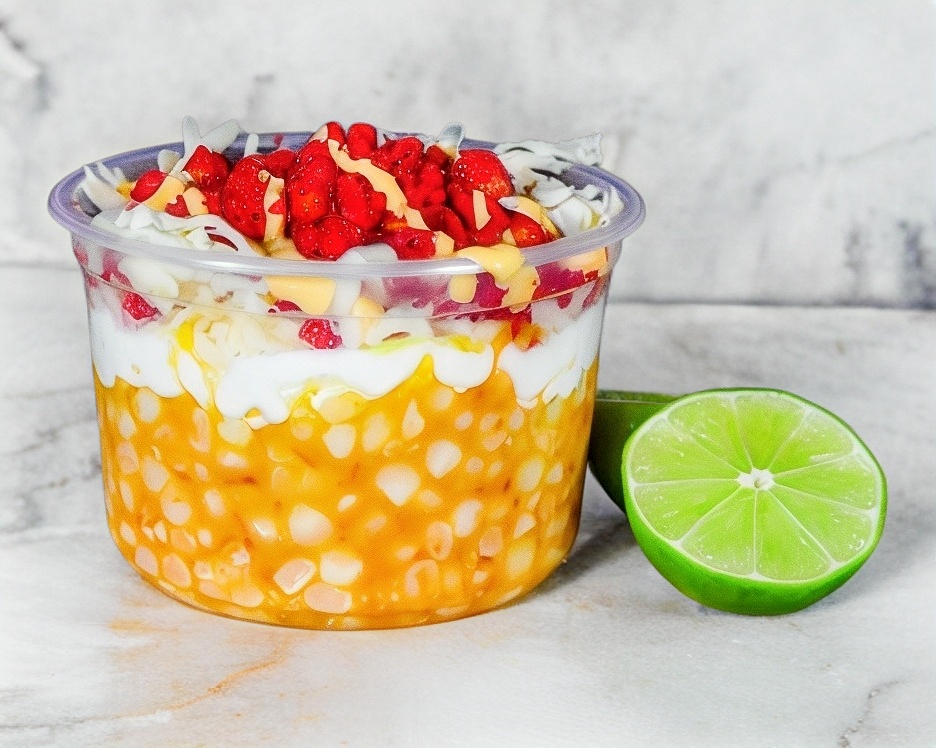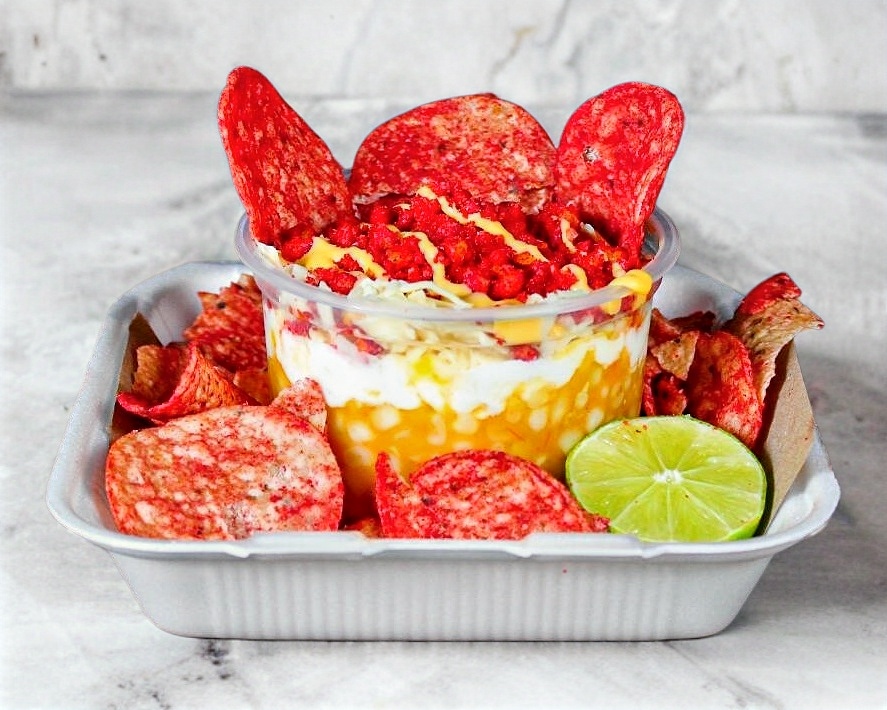 Vaso con 250 gramos de elote desgranado, acompañado de mantequilla, crema, mayonesa, salsa casera roja, queso amarillo, queso blanco rallado, polvo de cheetos flamin' hot y medio limón aparte.