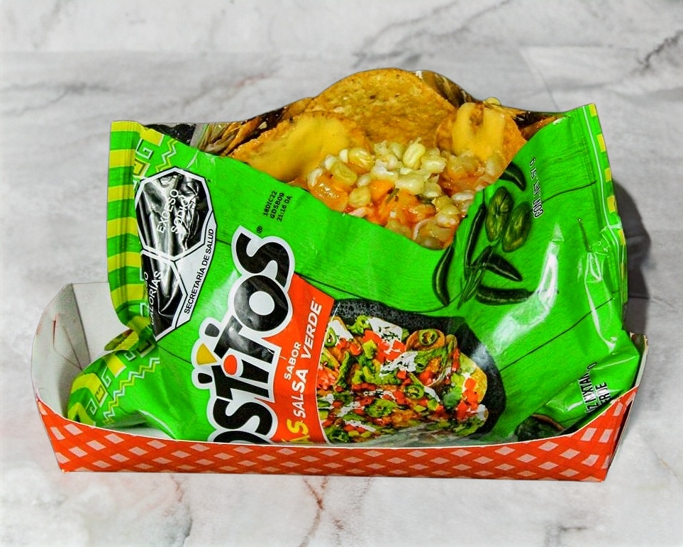 Vaso con 250 gramos de elote desgranado, acompañado de mantequilla, crema, mayonesa, salsa casera roja, queso amarillo, queso blanco rallado, polvo de cheetos flamin' hot y medio limón aparte. Servido en una charola con papitas de tu elección.