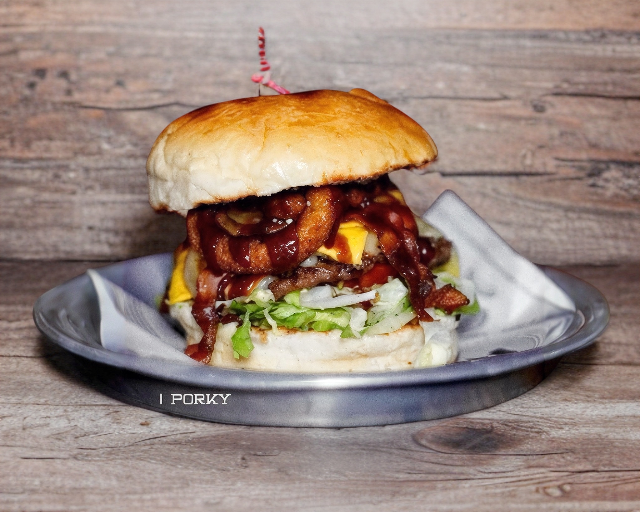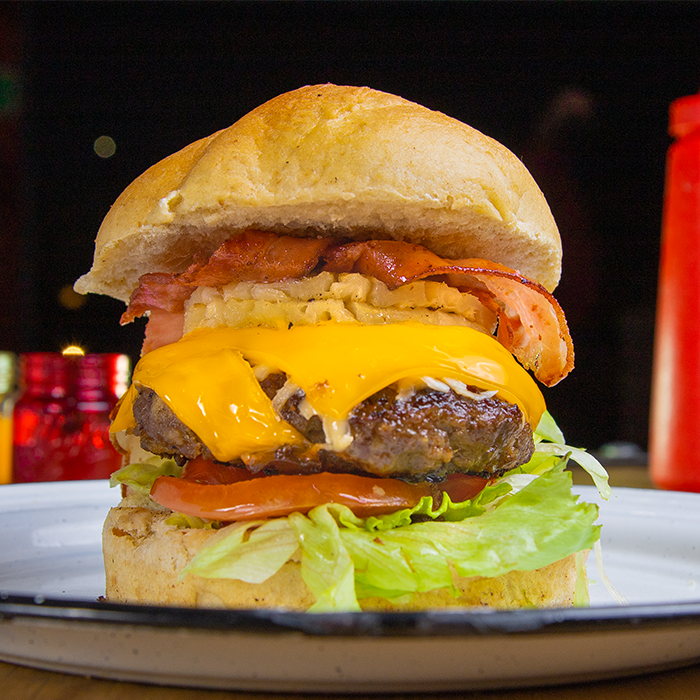 180 Grs. carne de res, queso amarillo, queso blanco, aguacate, doble tocino, salsa BBQ de la casa y aros de cebolla.