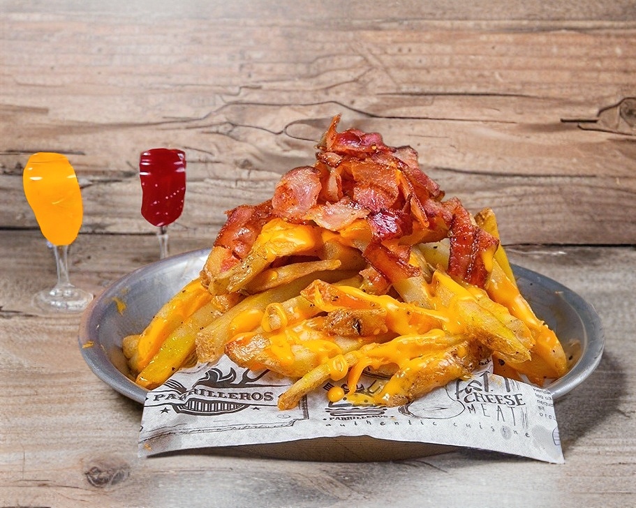 300 Gr. de papás fritas bañadas en salsa de queso y tocino doradito.