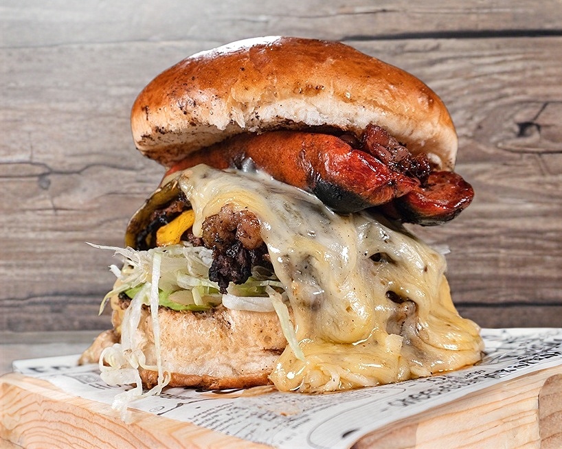 180 Grs. de carne de res, queso amarillo, aguacate, tocino, salchicha asada y vegetales.