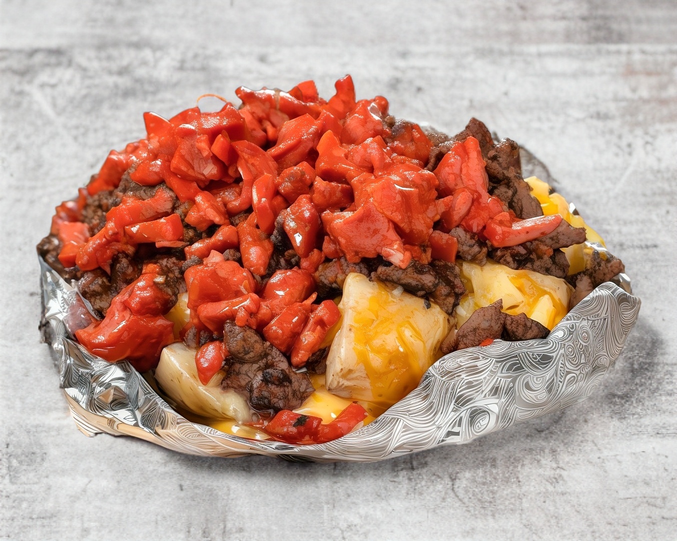 Papa gigante asada rellena de 250 grs. de carnita asada, mantequilla, queso blanco, queso amarillo y salchicha; Acompañada de tortillas, pico de gallo y salsa de la casa.