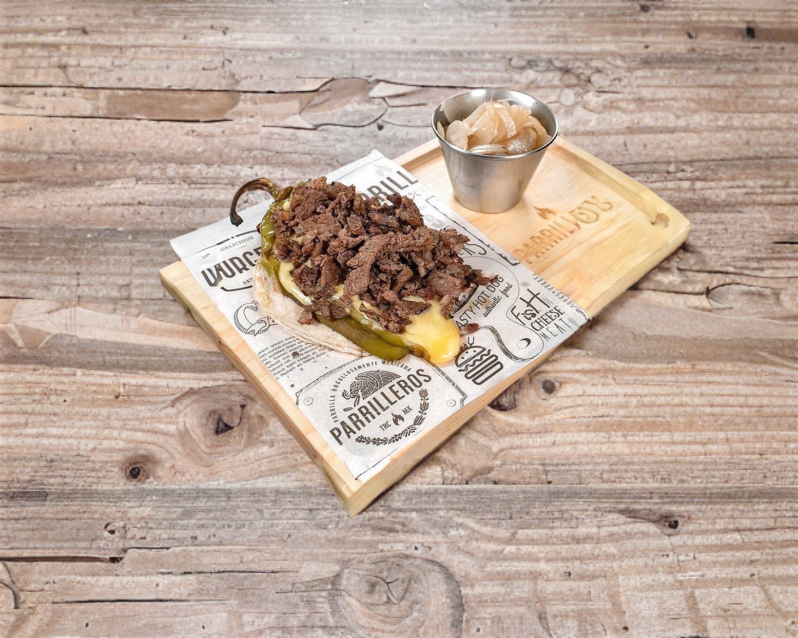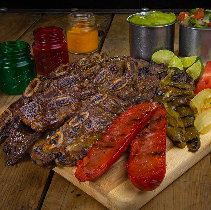 180 Grs. de carne asada, chilaca con queso gratinado, tocino, aguacate, salchicha asada y vegetales.