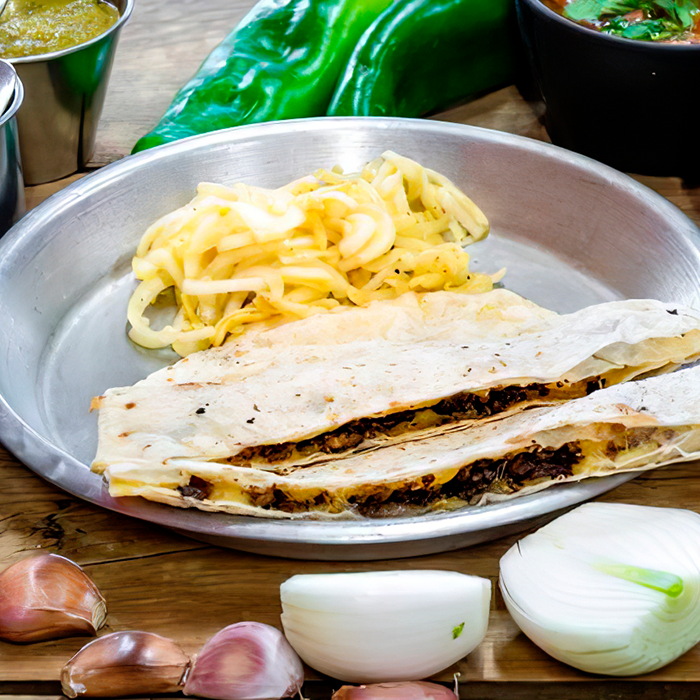Con queso blanco gratinado, servida en tortilla doble, acompañado de cebollita caramelizada, pico de gallo y guacamole.