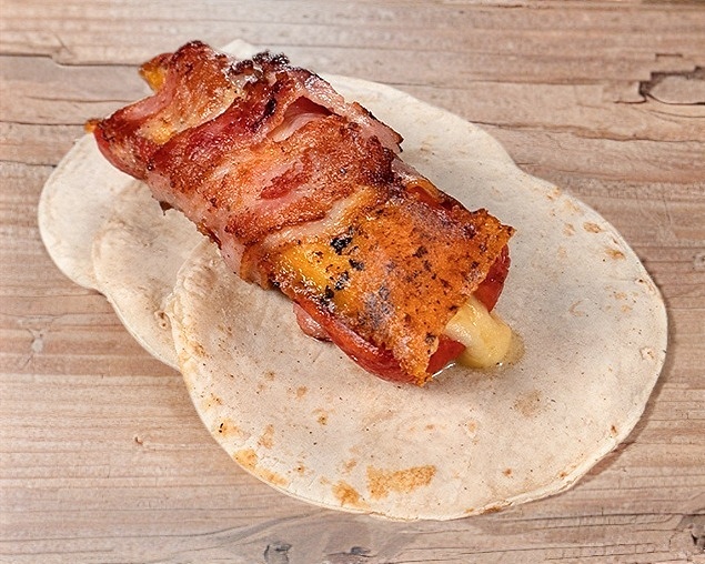 Salchicha asada con tocino doradito, servido en tortilla doble con cama de queso gratinado, acompañado de ensalada, cebolla caramelizada y salsa de la casa.