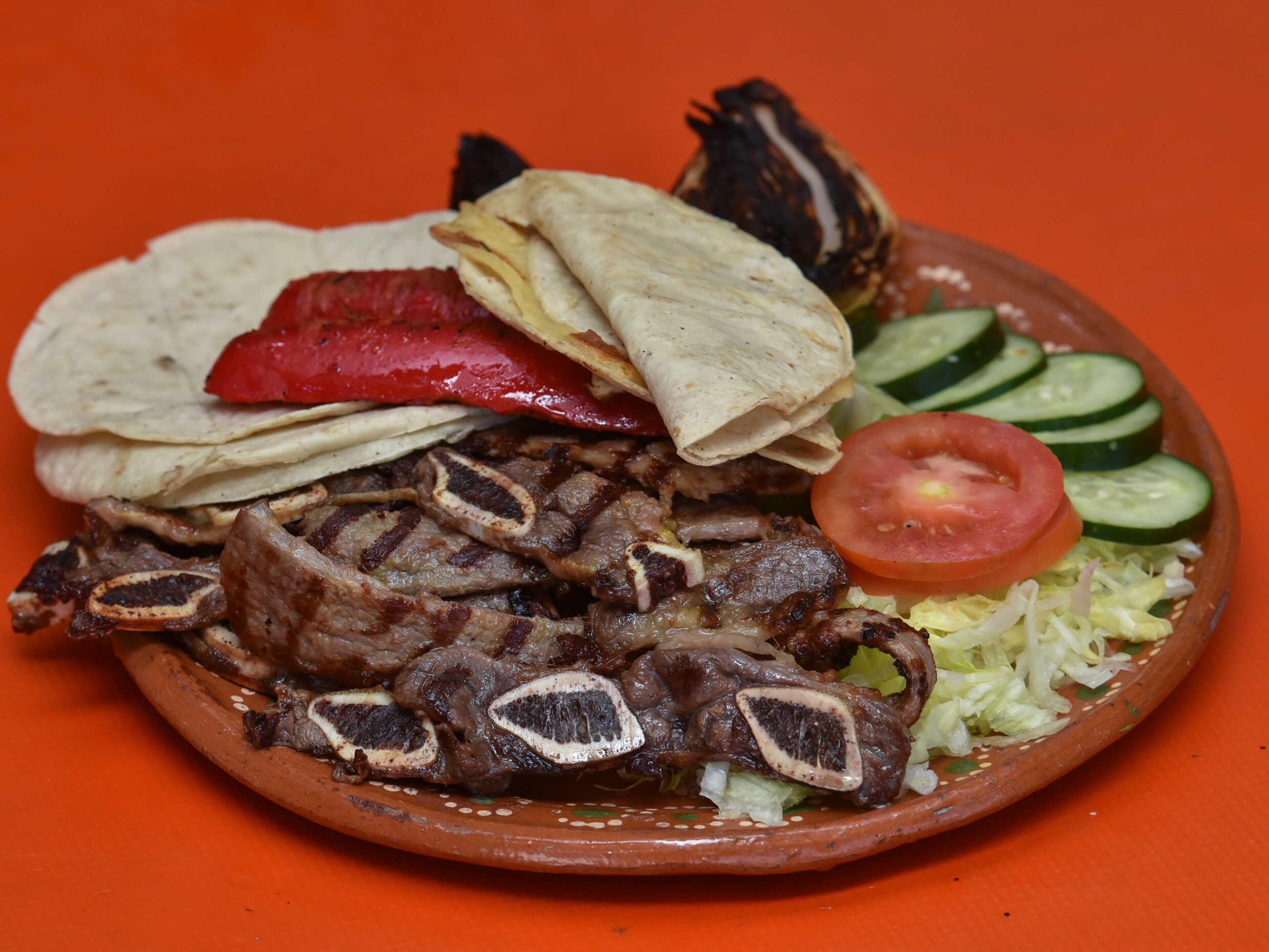 500Gr de costilla peso crudo, acompañado de cebollita asada, chiles toreados, salchicha asada, frijoles charros, salsa tortillas con su ensalada.